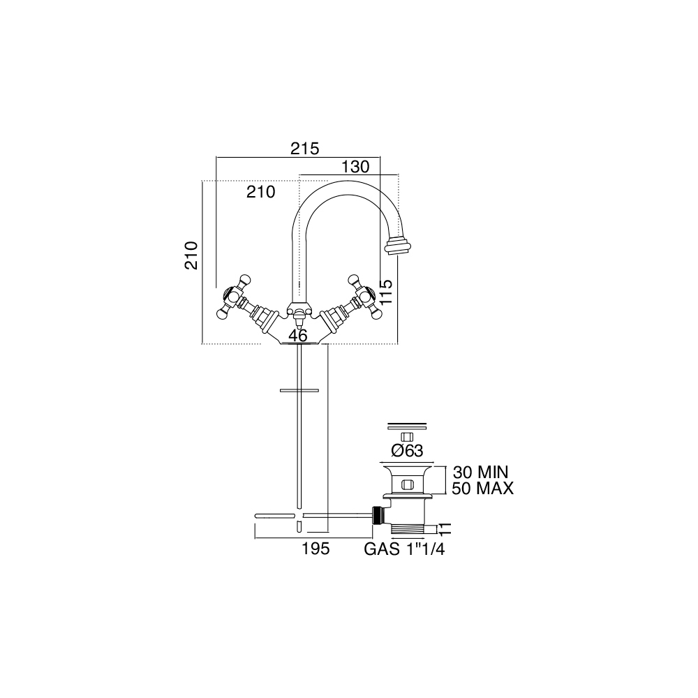 Brass single-hole high spout mixerĀ in brass, vintage style, Elisea, made in Italy.