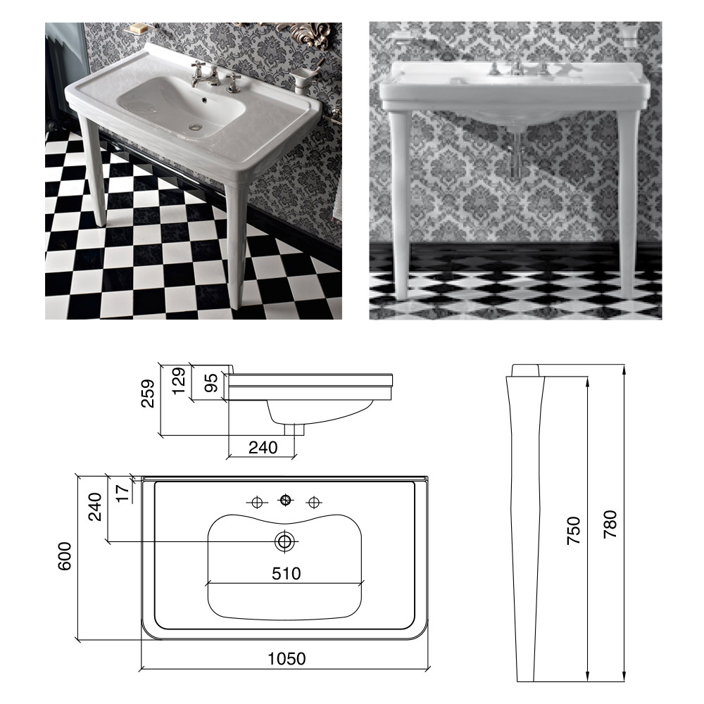 1 or 3 tap holes (specify the number of holes required when ordering), and is 1050 mm long.