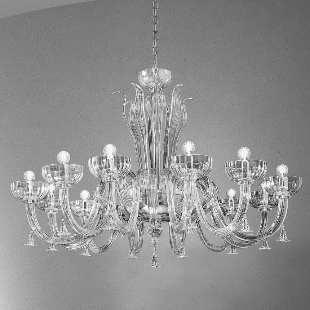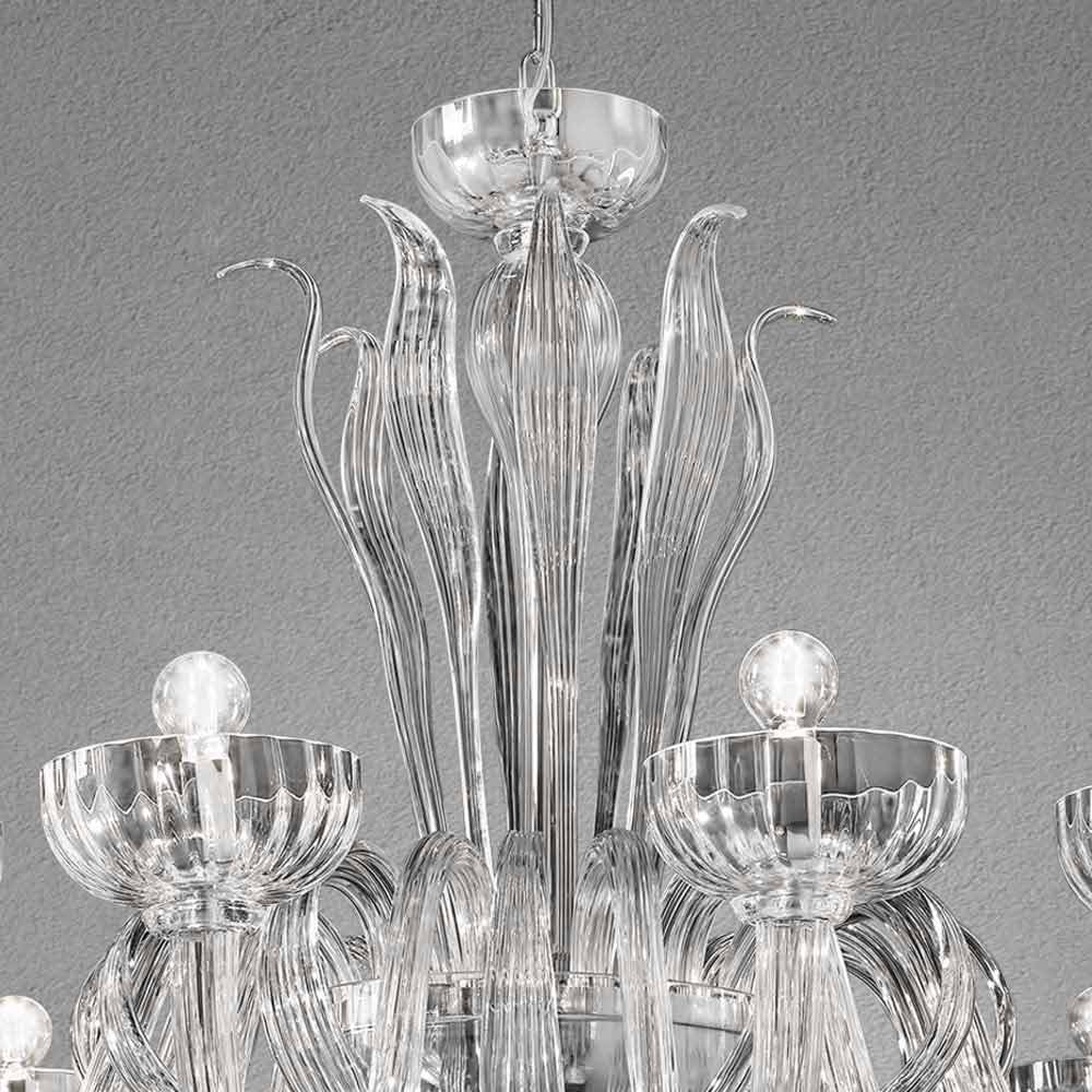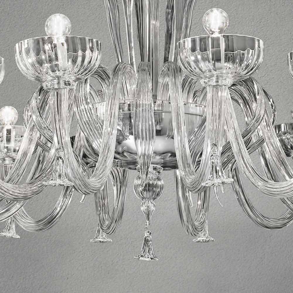 Refined chandelier with a classic design handcrafted in Italy, in Venice, in crystal finish glass with details in polished chrome metal . Conceived and designed to give light to large spaces such as entrances, lounges or dining rooms, this wonderful and elegant piece of furniture is able to characterise any environment bringing with it a majestic touch of the past. Its aesthetic is made unique by the tapered arms embellished with completely hand-shaped hanging bells for a result of high quality and priceless value . The sober and elegant finish allows the chandelier to complete any environment with style and personality , from the most classic to the most modern, basing its furniture on a wonderful play of contrasts for an unprecedented result .