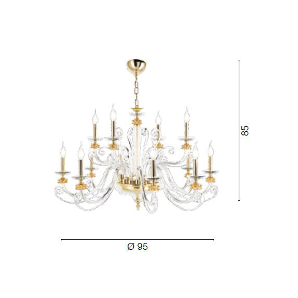 Handcrafted 12 lights chandelier in blown glass and optical crystal, luxury made in Italy.