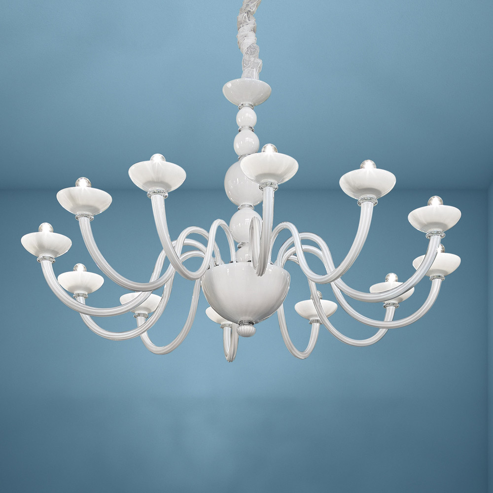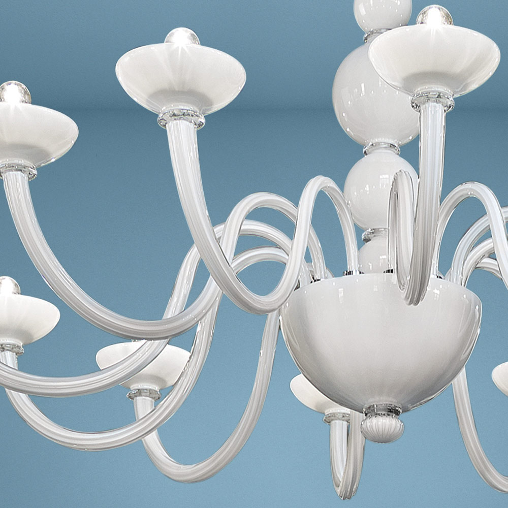 Handcrafted Venice glass chandelier in milk white crystal finish with details in polished chromed metal . A piece of furniture with an amazing and iconic presence characterized by a soft and delicate line and refined curves that adapt perfectly to classic environments but at the same time also to spaces with a contemporary style. The element of tradition is punctuated by its marvellous components in entirely hand-made blown glass which is transformed to update itself thanks to trendy colours. Its enveloping shapes make it an ideal element to occupy any environment, both domestic and contract, with class and dynamism .