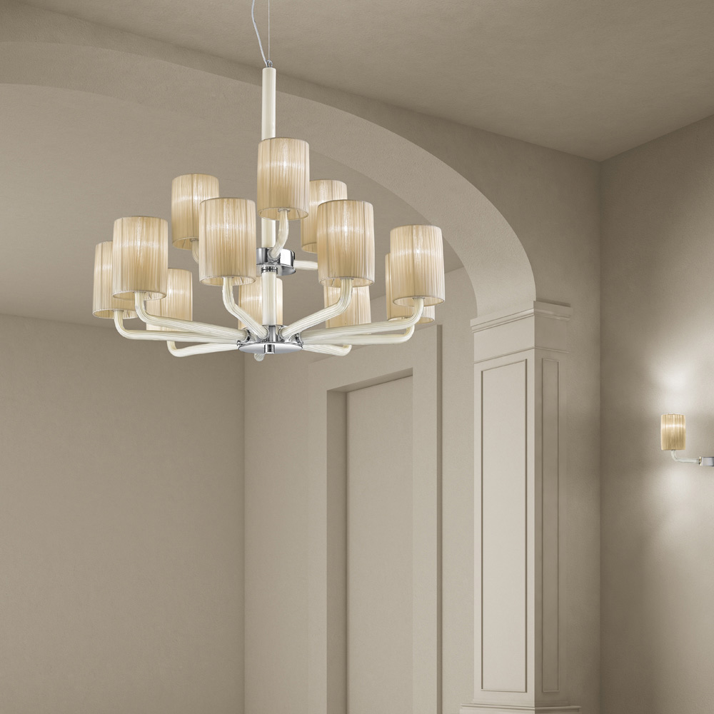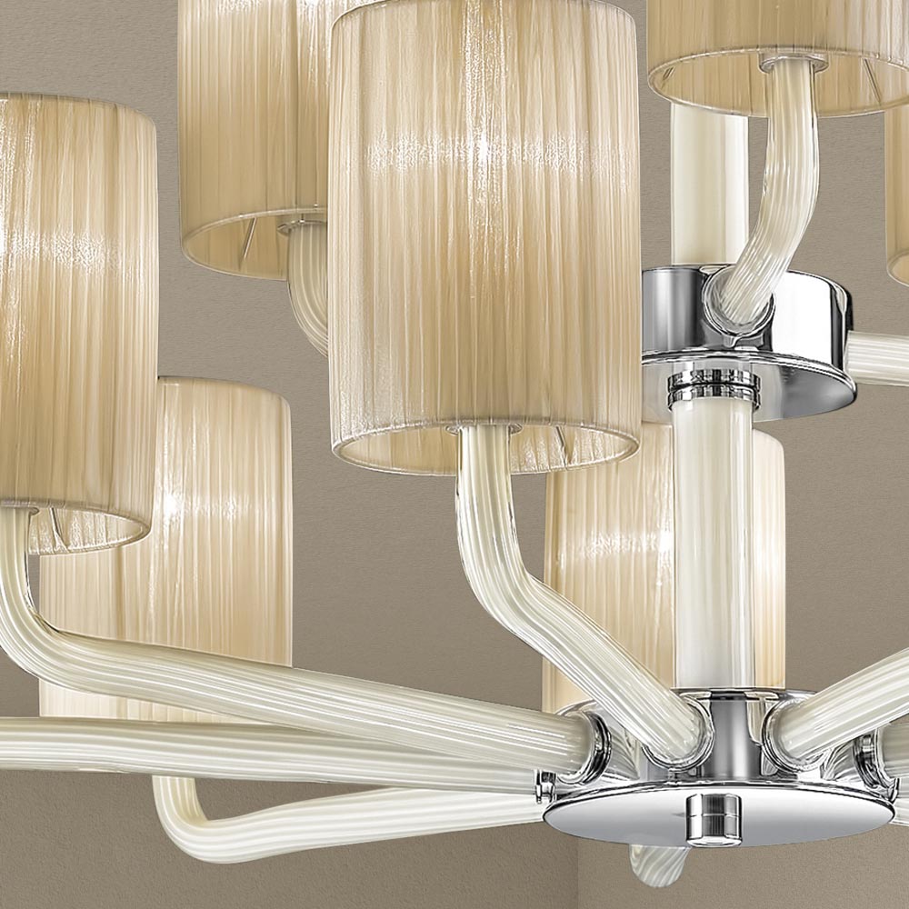 12 lights chandelier handcrafted in Italy in Venice glass with milk white-ivory finish with metal details in polished chrome finish and elegant fabric lampshades . A piece of furniture characterized by an articulated but essential design , able to enrich the environment giving character thanks to its strong stage presence typical of the classic chandeliers of the past. The tubular glass arms support in a delicate and classy way the wonderful fabric lampshades which help to carry the light in every direction for a warm , soft and enveloping lighting.