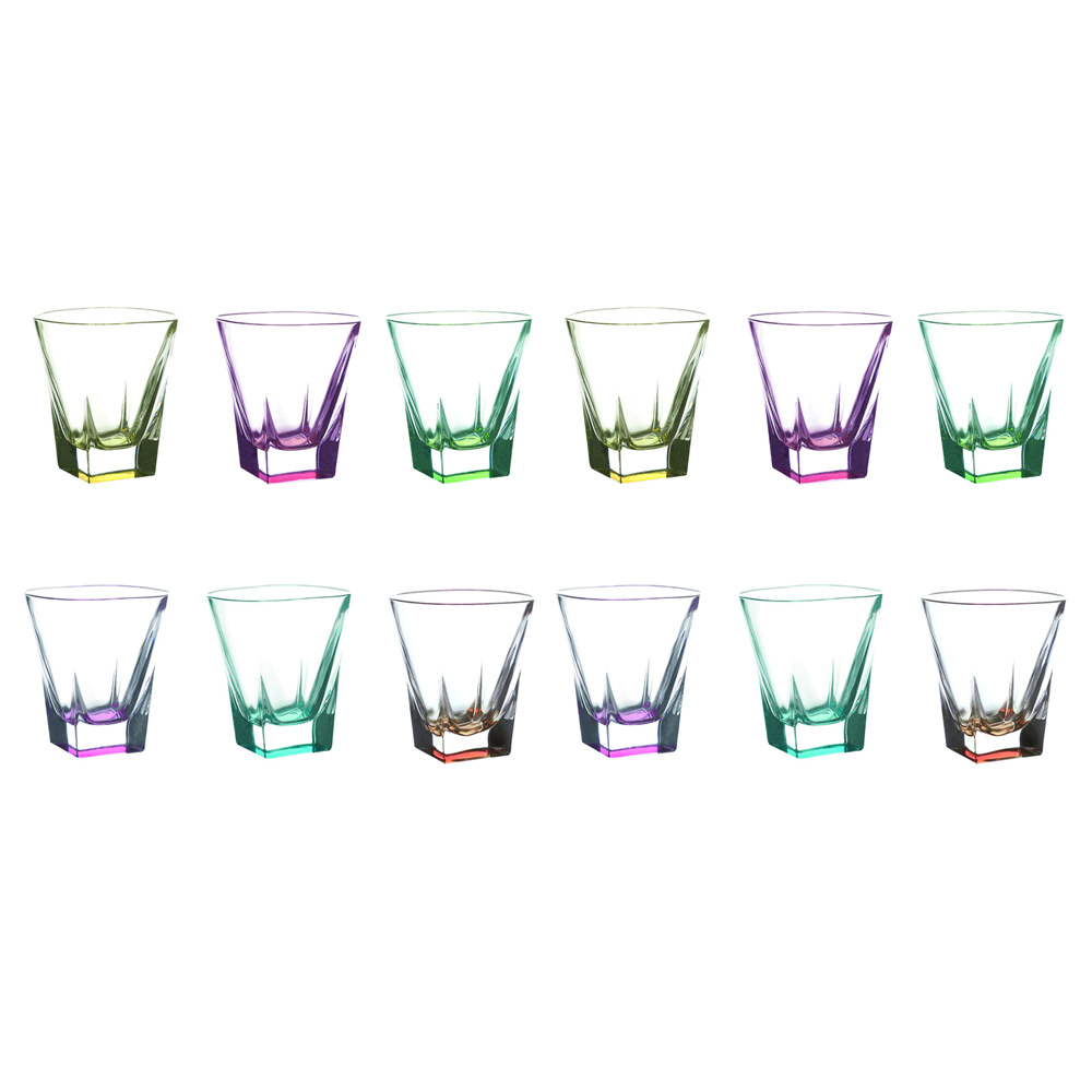 Glasses for spirits in transparent or colored eco crystal, 12 pieces made in Italy.