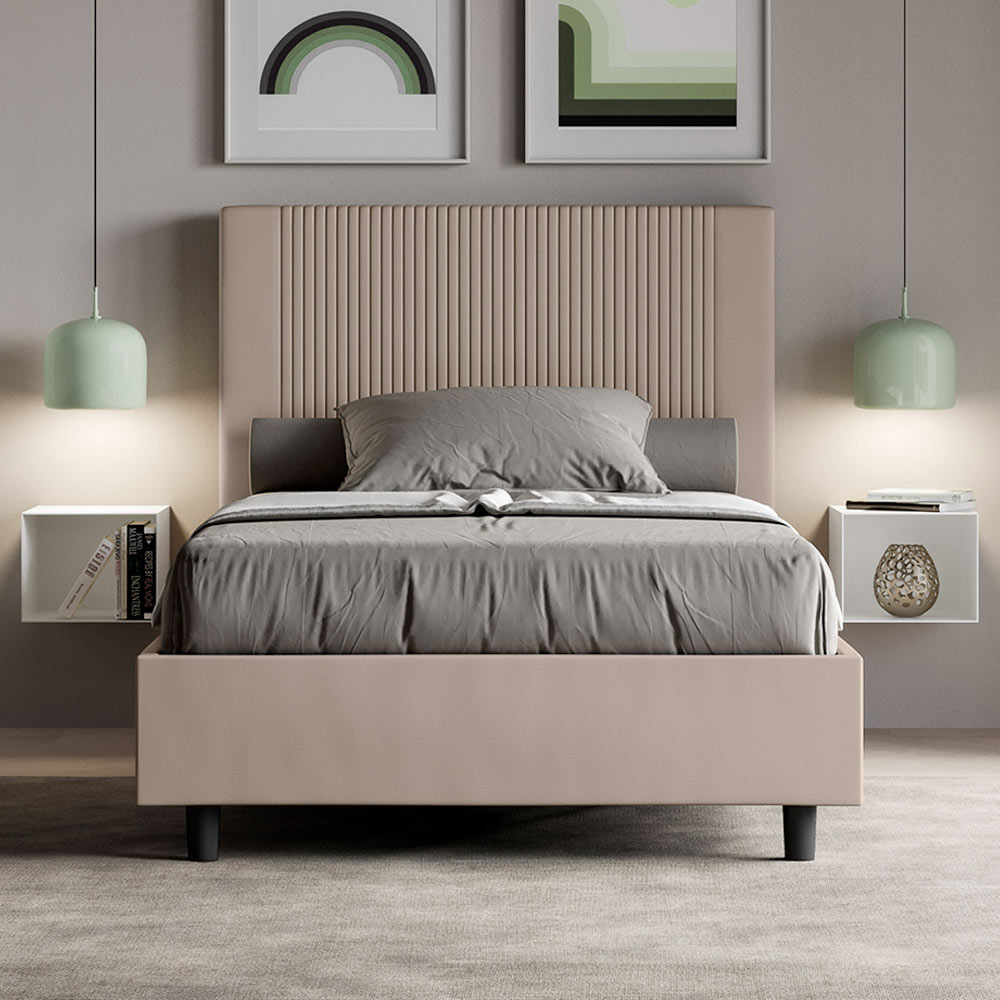 This queen-size bed, with its padded bed frame, is a product of Italian manufacture crafted from faux leather. Its simple yet modern design is perfect for spaces distinguished by sophisticated elegance. The main feature of this model is its headboard, adorned with a vertical line motif , ideal for those who want to combine it with visually striking spaces with prominent walls, while maintaining an unmistakable elegance.