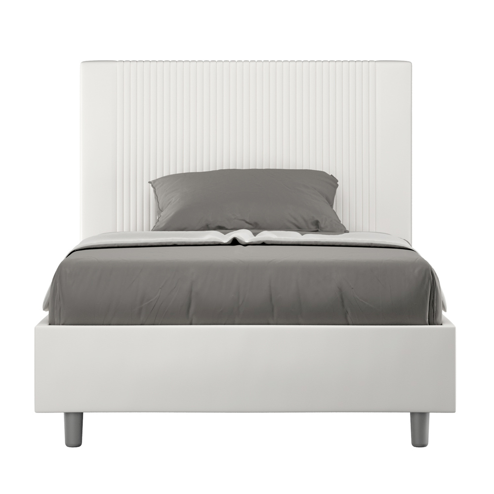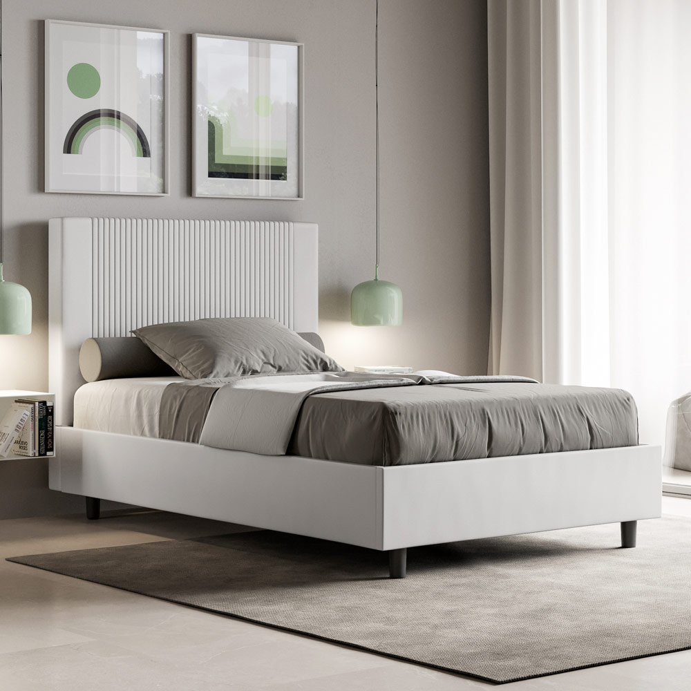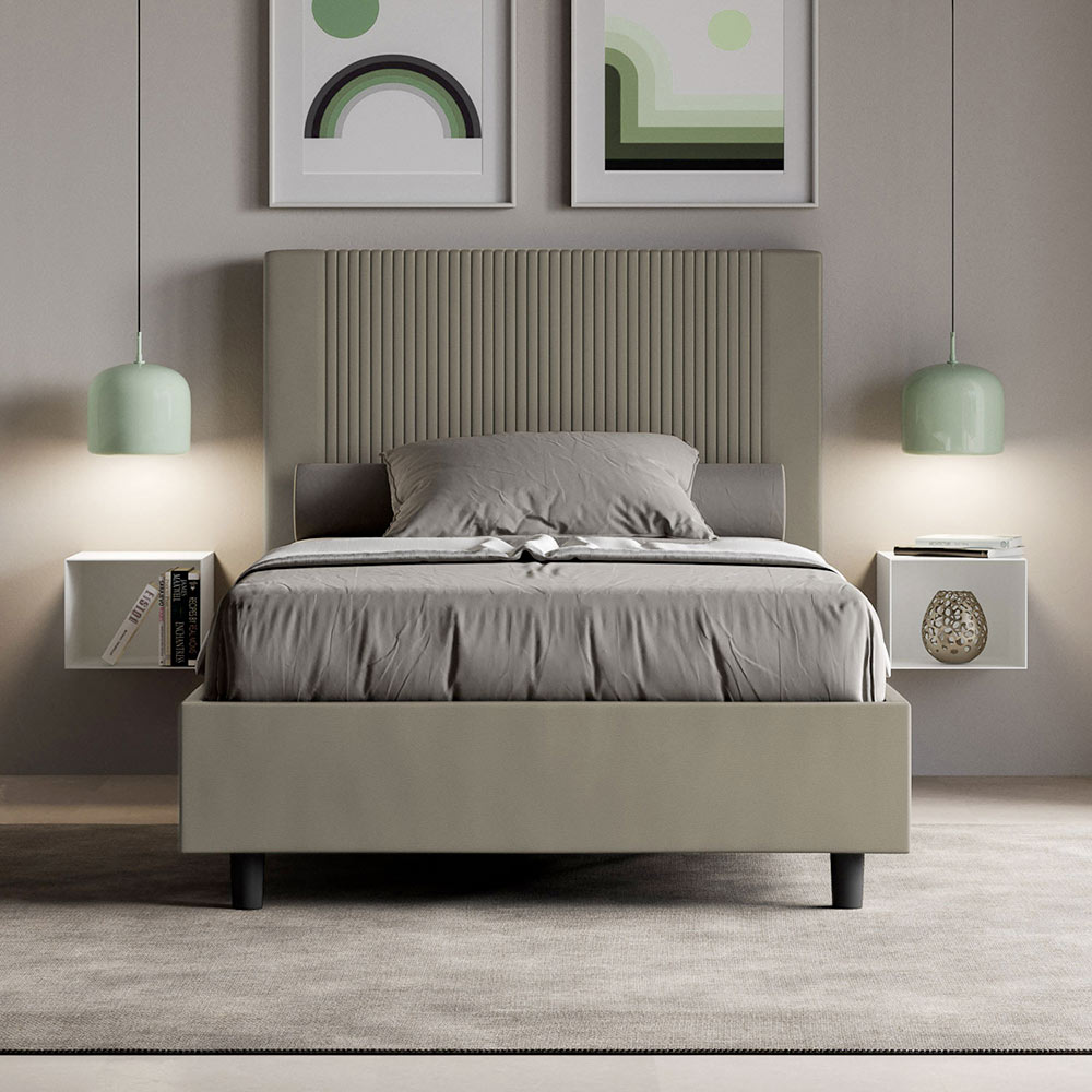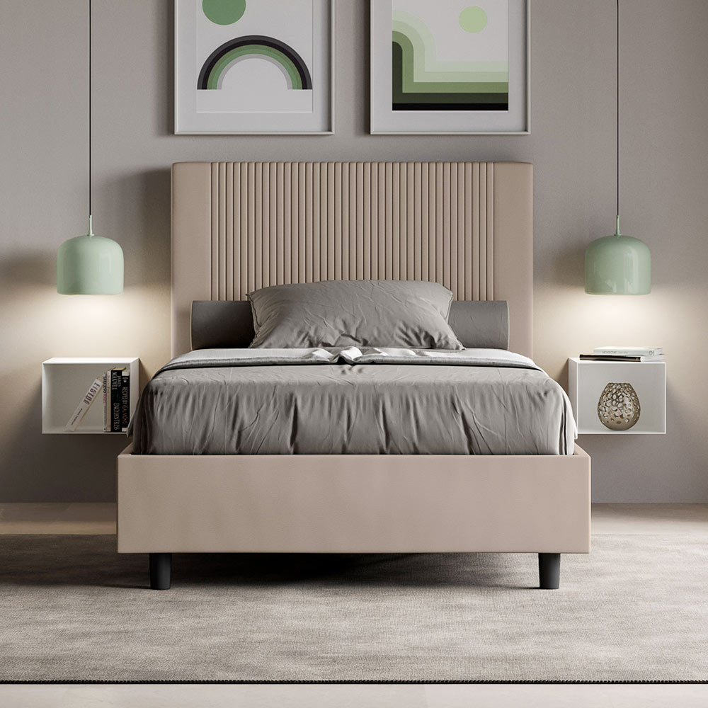 French bed 140x200 cm padded made of melamine panels and covered in imitation leather , entirely Made in Italy. This French bed, with its padded bed frame, is a product of Italian manufacture made of faux leather. Its simple yet modern design is perfect for spaces distinguished by sophisticated elegance. The main feature of this model is its headboard, adorned with a vertical line motif , ideal for those who want to combine it with visually striking spaces with prominent walls, while maintaining an unmistakable elegance.