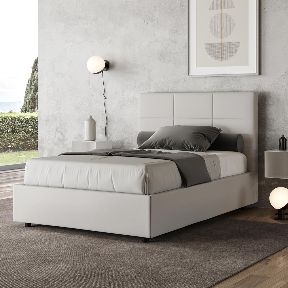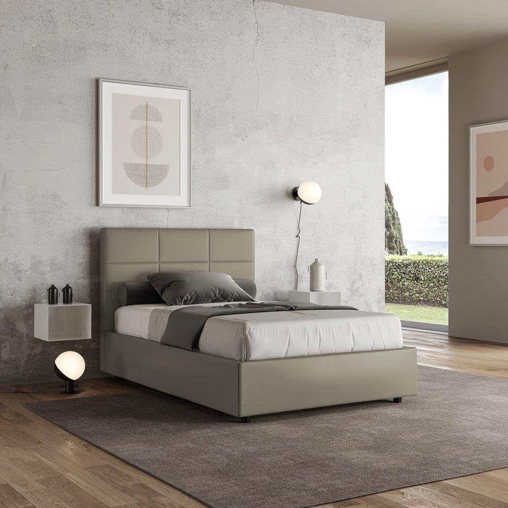 French bed 140x200 cm padded made of melamine panels and covered in imitation leather , entirely Made in Italy. This bed, with its padded frame, is the perfect example of how elegance and comfort can be combined in a single piece of furniture. This model is characterized by itsHeadboard enriched with rectangular geometric patterns . Upholstered in faux leather, it is easy to keep clean: just a microfiber cloth is enough for quick and effective cleaning.