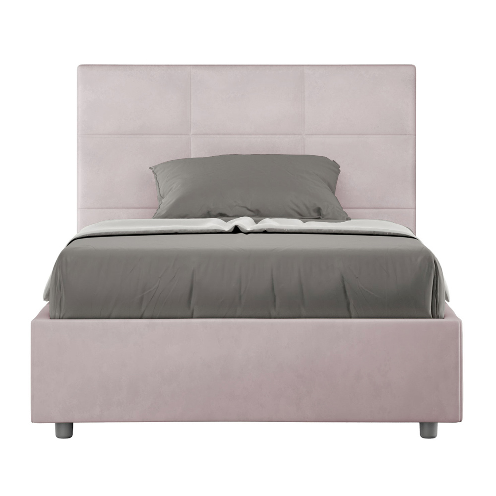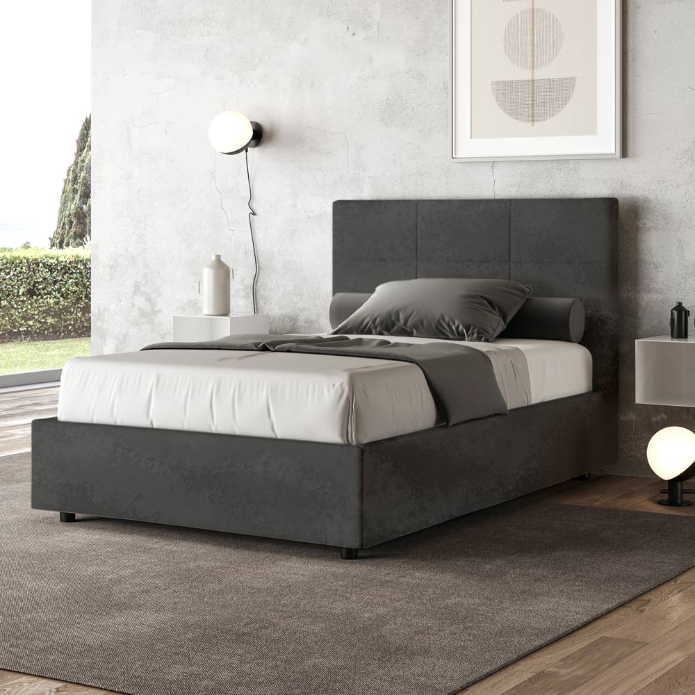 French bed 140x200 cm padded made of melamine panels and covered in microfibre , entirely Made in Italy. This bed, with its padded frame, is the perfect example of how elegance and comfort can be combined in a single piece of furniture. This model is characterized by its headboard enriched withRectangular geometric patterns . Covered in microfiber, it is easy to keep clean: just use a microfiber cloth for quick and effective cleaning.