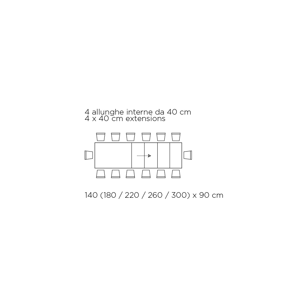 - L 140 (300) x D 90 x H 75 cm 14 seater extendable with four internal extensions of 40cm each;