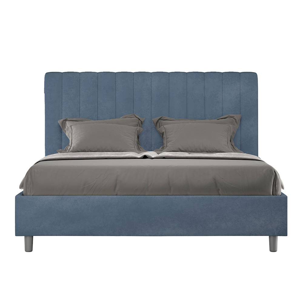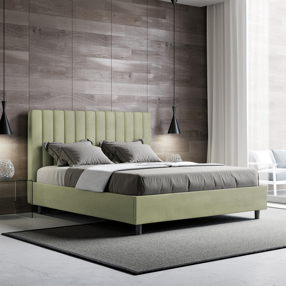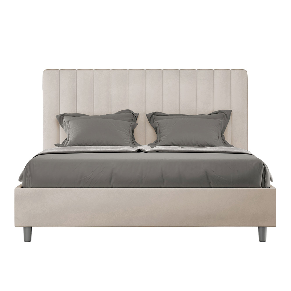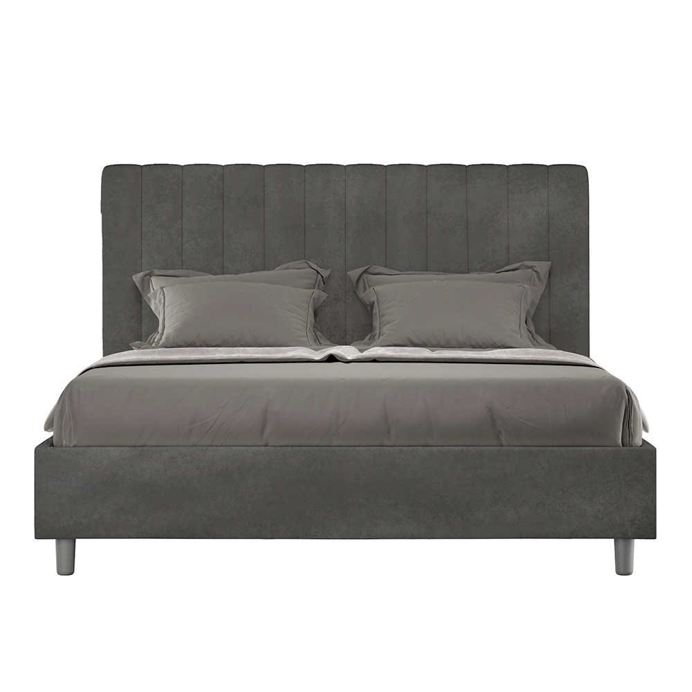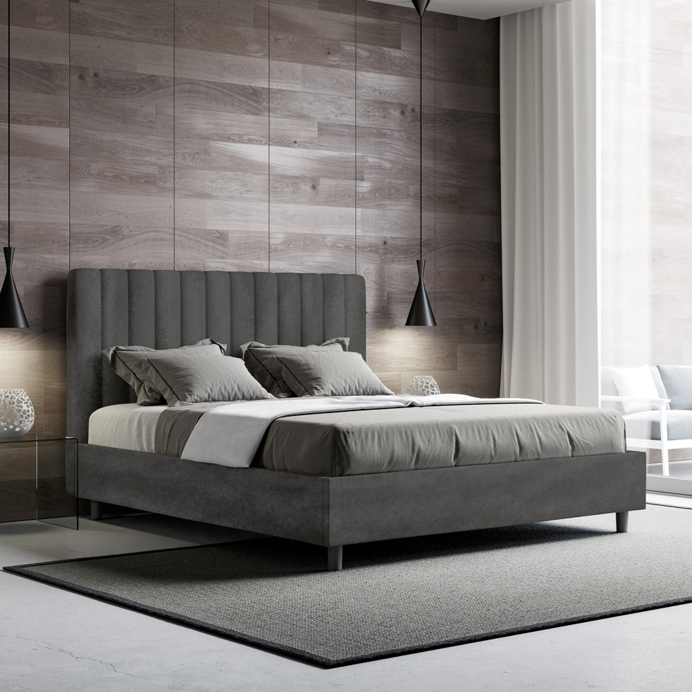 160x200 cm padded double bed made of chipboard panels and covered in microfibre , entirely Made in Italy. This double bed with an upholstered frame is ideal for those seeking a statement piece without being overly dramatic. This bed boasts a minimalist headboard with a delicate quilted effect of symmetrical vertical lines , which fits beautifully into any setting, whether modern or classic.
