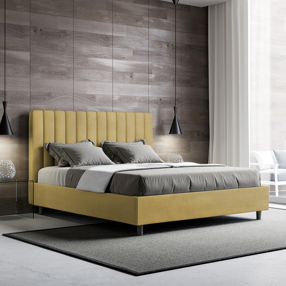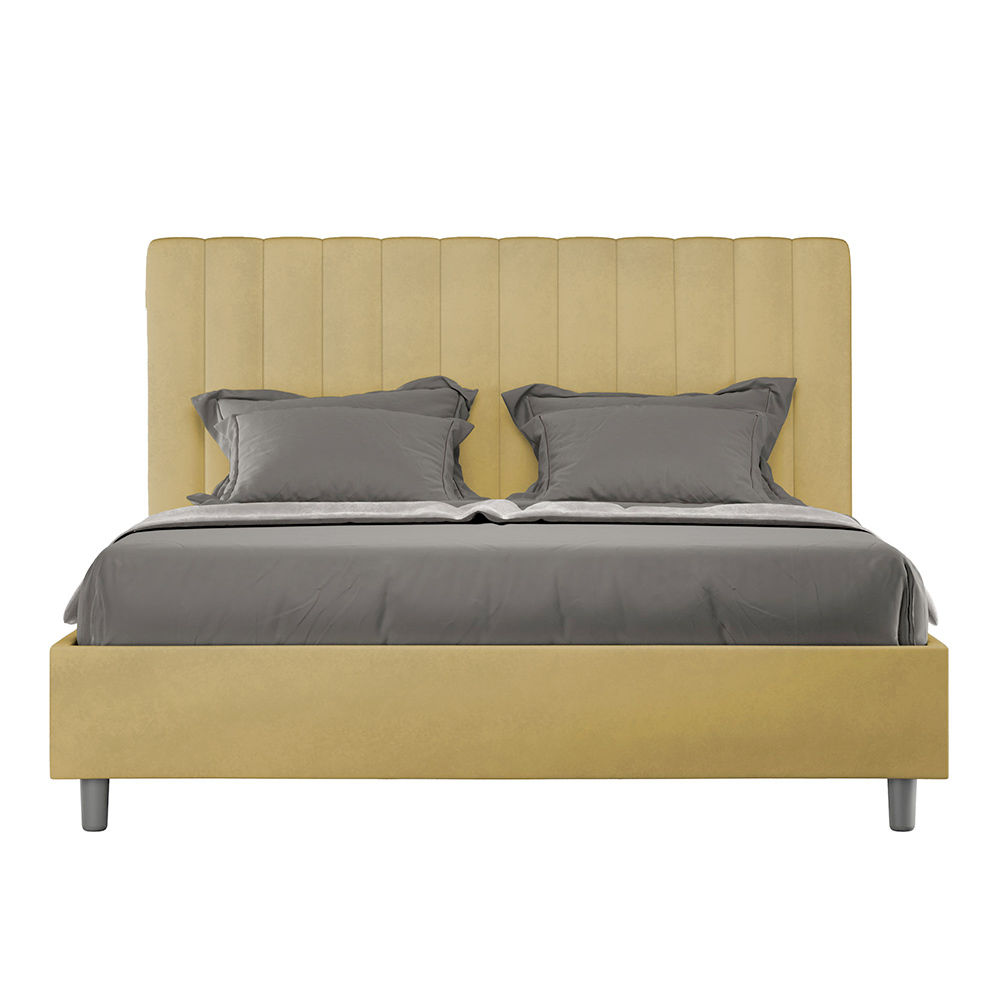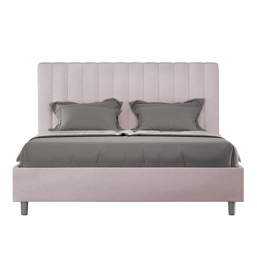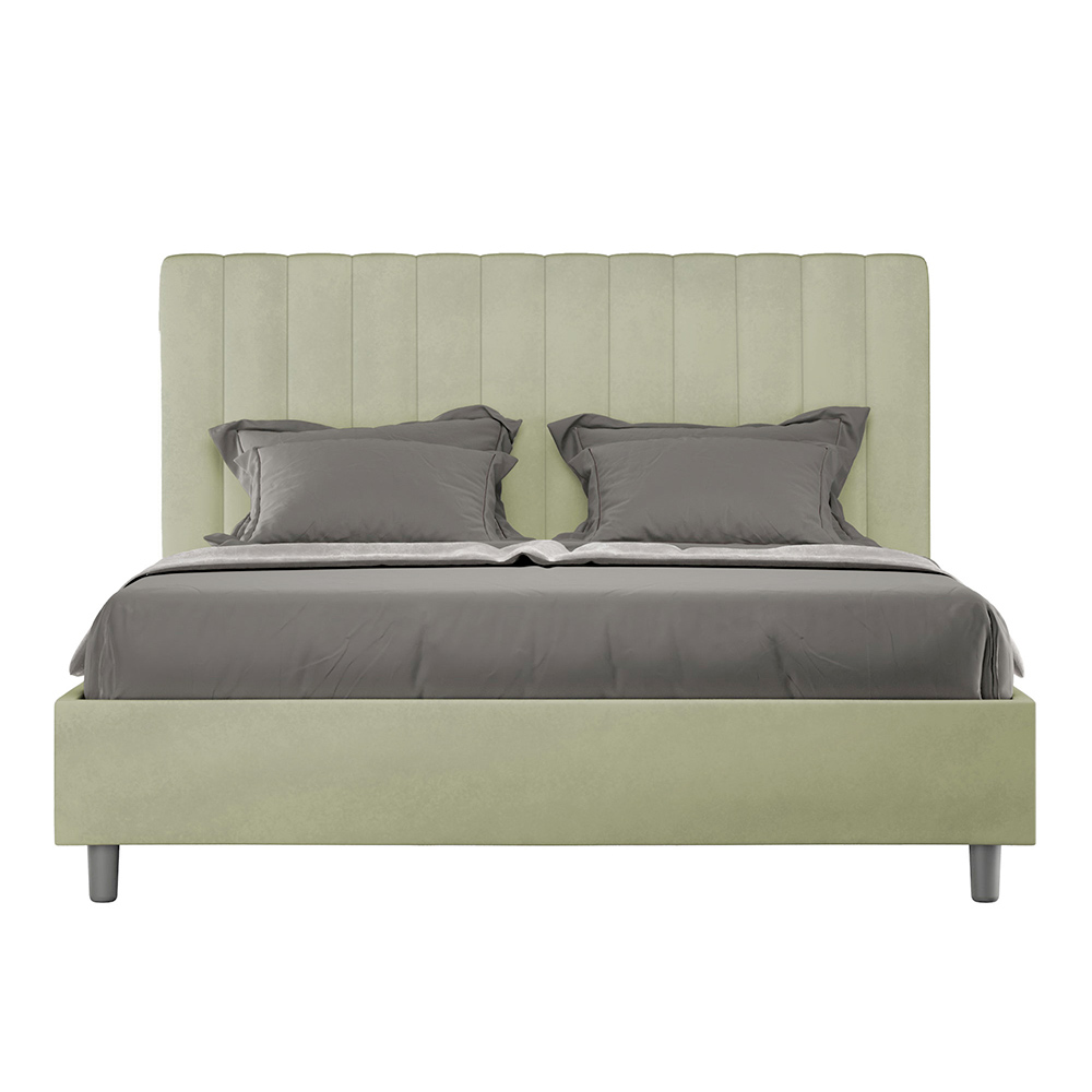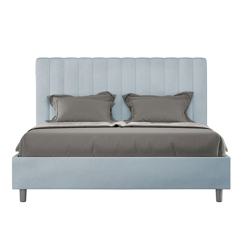 160x200 cm padded double bed made of chipboard panels and covered in microfibre , entirely Made in Italy. This double bed with an upholstered frame is ideal for those seeking a statement piece without being overly dramatic. This bed boasts a minimalist headboard with a delicate quilted effect of symmetrical vertical lines , which fits beautifully into any setting, whether modern or classic.