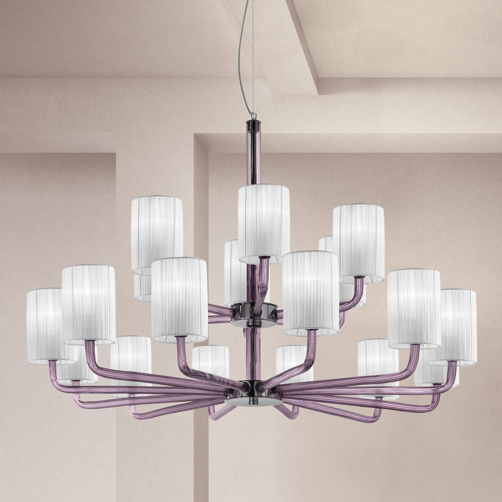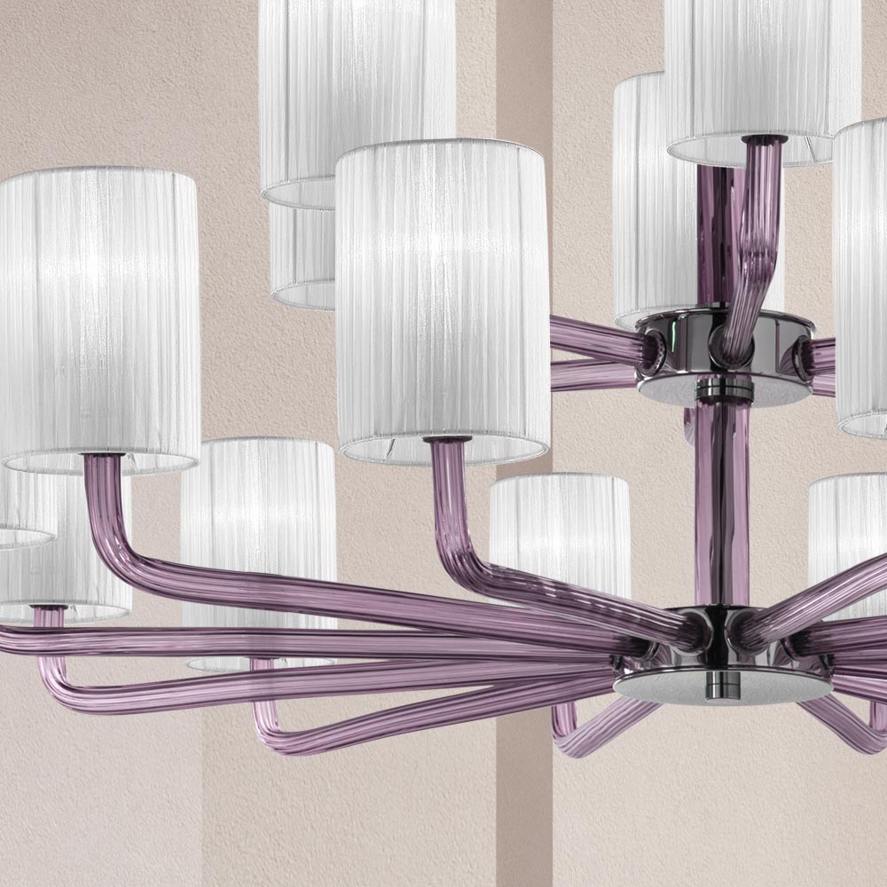 18 lights chandelier made in Italy in handcrafted amethyst finish Venice glass with polished chrome finish metal details and fabric lampshades . A piece of furniture characterized by an articulated but essential design , able to enrich the environment giving character thanks to its strong stage presence typical of the classic chandeliers of the past. The tubular glass arms support in a delicate and classy way the wonderful fabric lampshades which help to carry the light in every direction for a warm , soft and enveloping lighting.