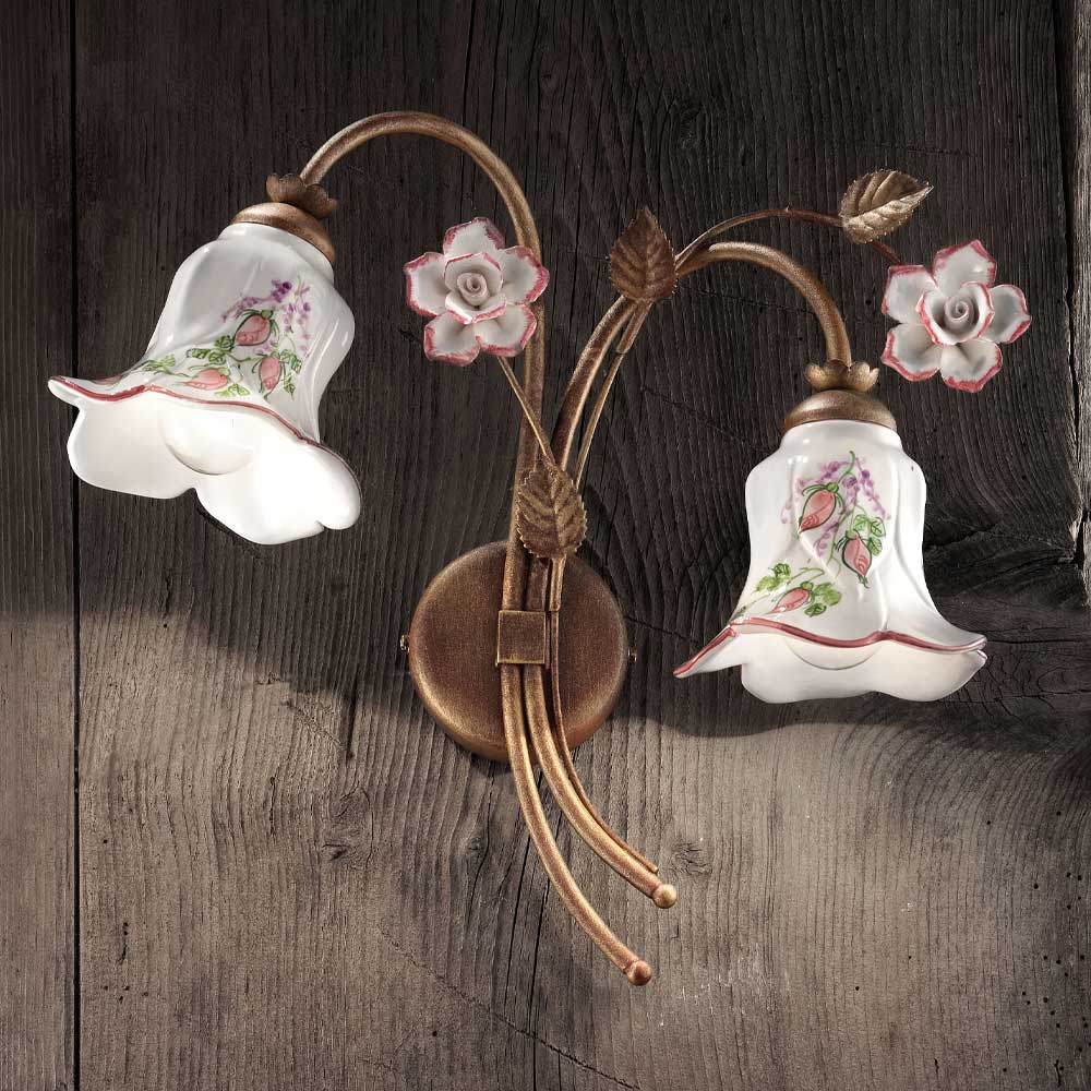 Wall lamp with 2 lights in metal and ceramic with hand-painted roses made in Italy by Ferroluce.