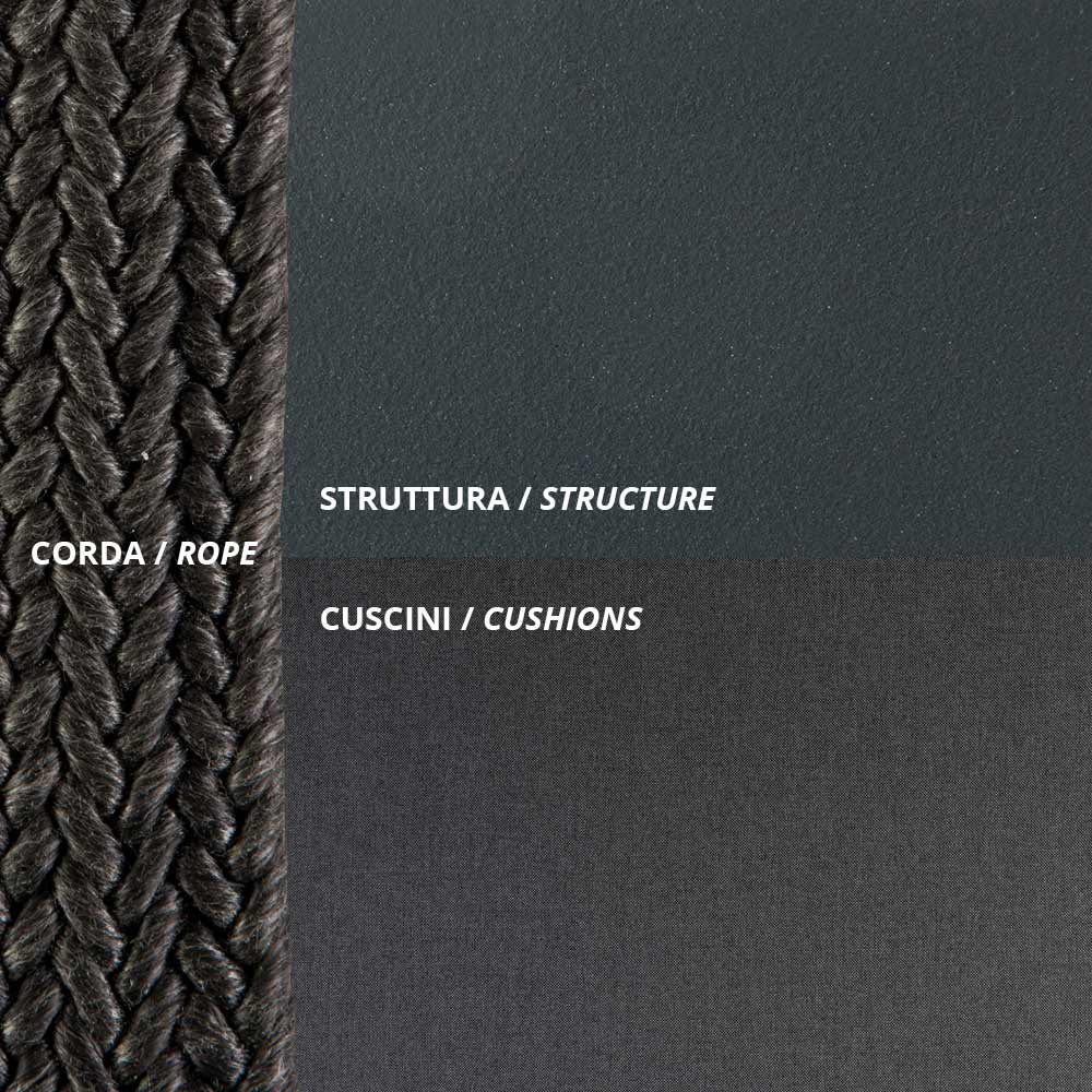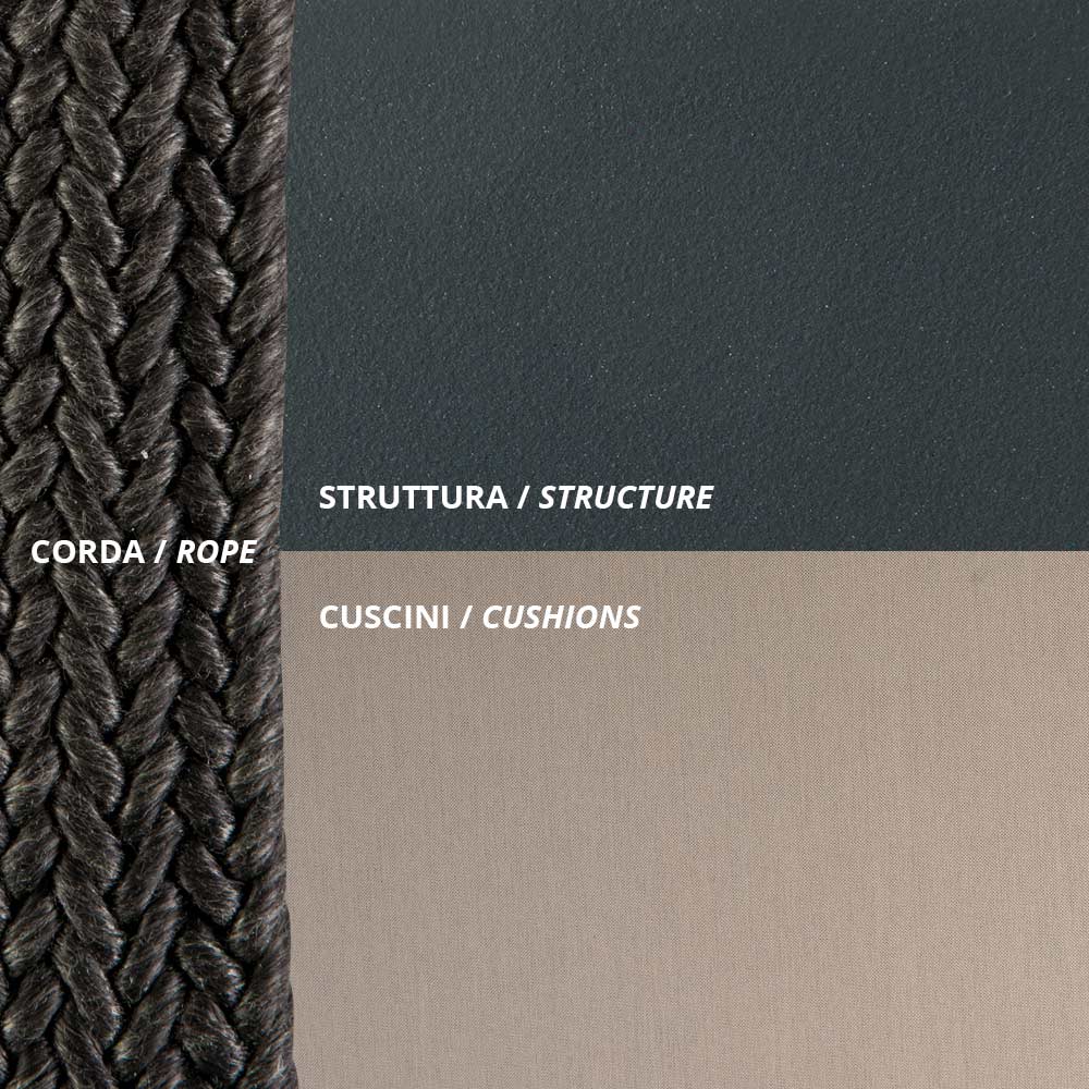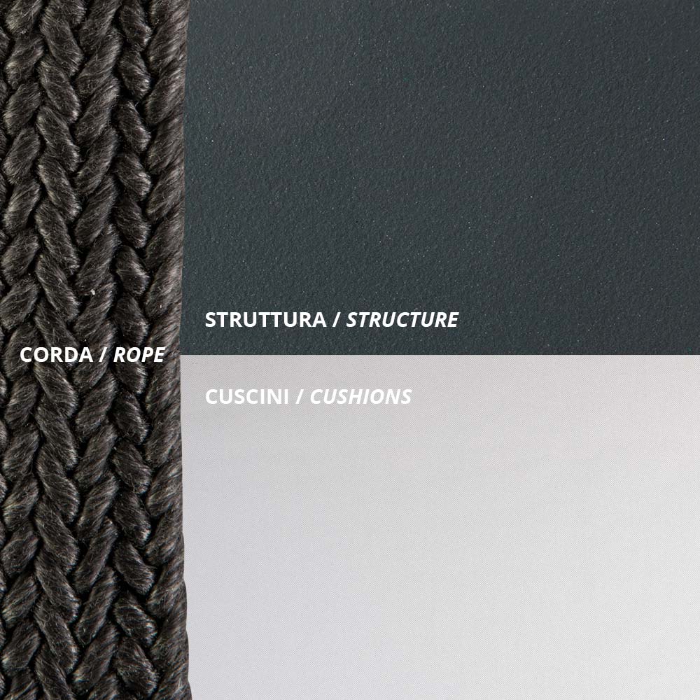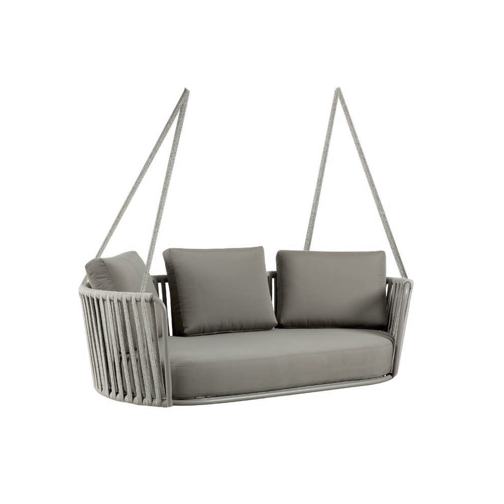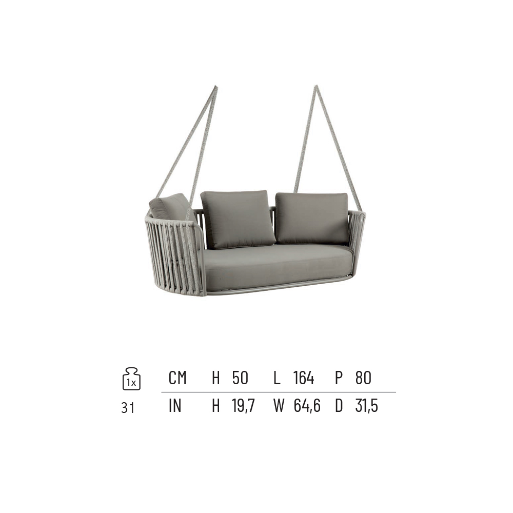 2-seater outdoor swing in powder-coated galvanized iron and rope with fabric seat Made in Italy.
