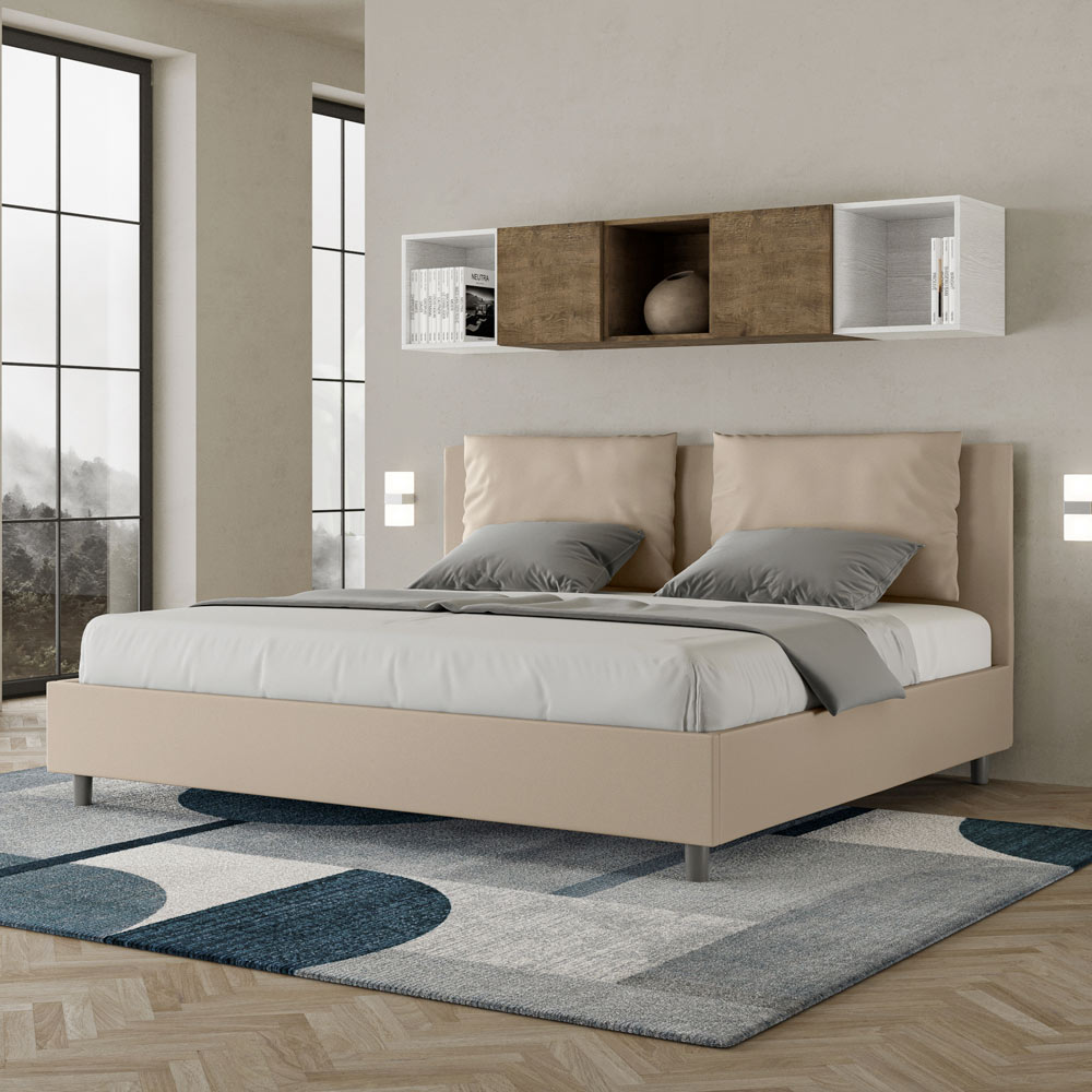 Super king size bed 200x200 cm padded made of melamine panels and covered in imitation leather , entirely Made in Italy. This super king-size bed with upholstered bed frame perfectly embodies the advantages of an upholstered bed: comfort, contemporary style, functionality, and efficient use of space . This bed, with its wide- cushioned headboard , offers a relaxing corner ideal for reading or watching TV, enhancing your bedroom. Elegant and stylish, this bed is upholstered in faux leather, making cleaning quick and easy: simply wipe it with a microfiber cloth to keep it sparkling.