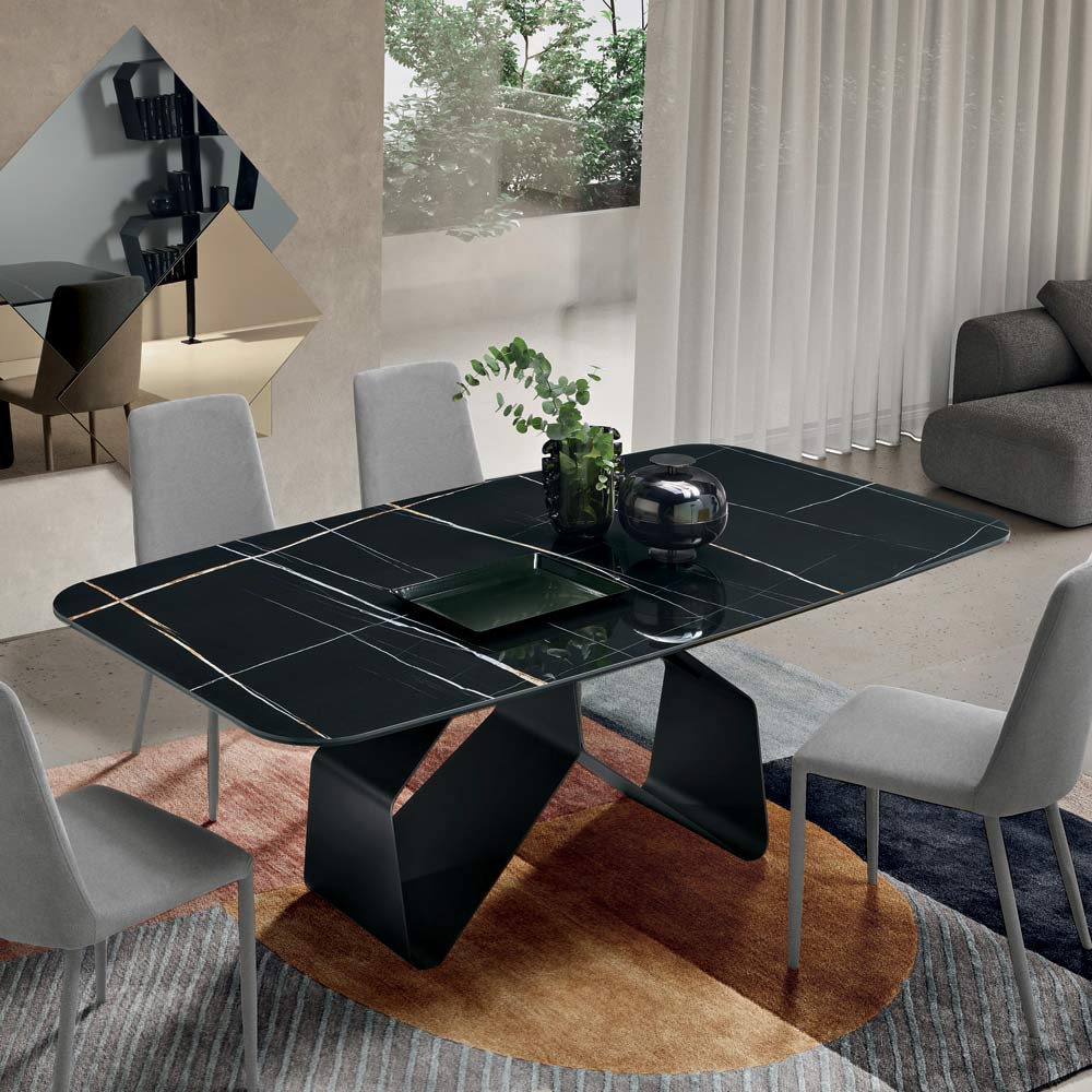 A refined, Made in Italy designer dining table , ideal for elegantly furnishing the dining room or living area . The table stands out for its distinctive painted metal base with a light and dynamic graphic design reminiscent of two stylized wings, creating a strong visual impact while maintaining great aesthetic balance.