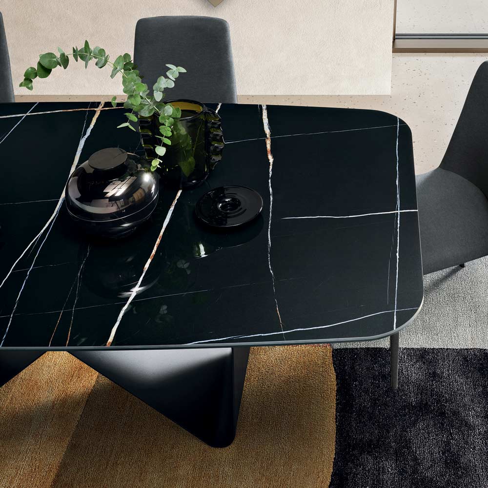 The combination of the materiality of the ceramic and the sculptural metal structure creates a perfect balance between contemporary design and functionality, making this table a protagonist of the dining area.