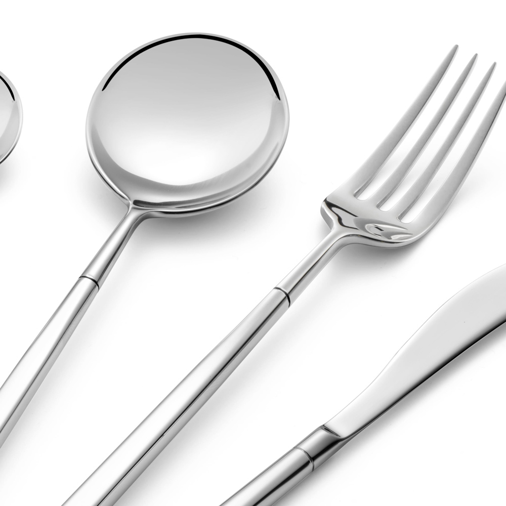 The elongated shape and elegant flat profile of the handles combine with the rounded pairs of the spoons, which are not only beautiful to look at but also ergonomic, ensuring comfortable use during meals. These features make the set particularly suitable for those who appreciate contemporary design .