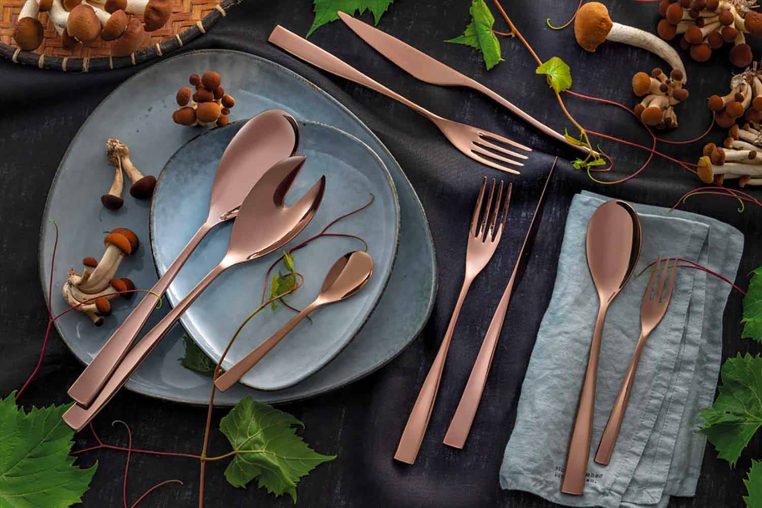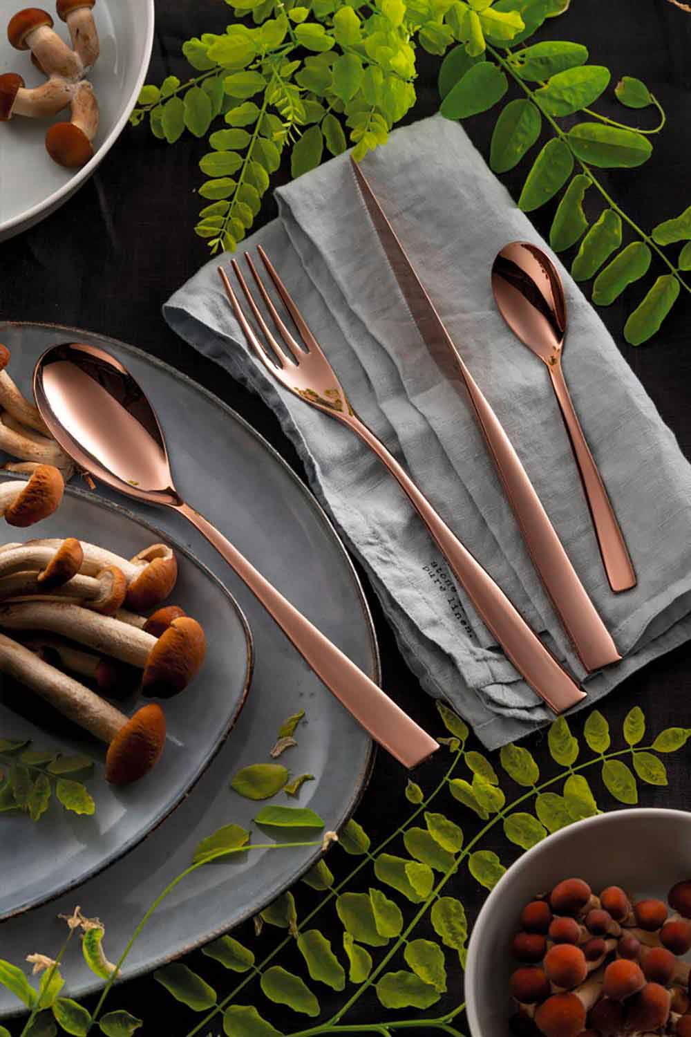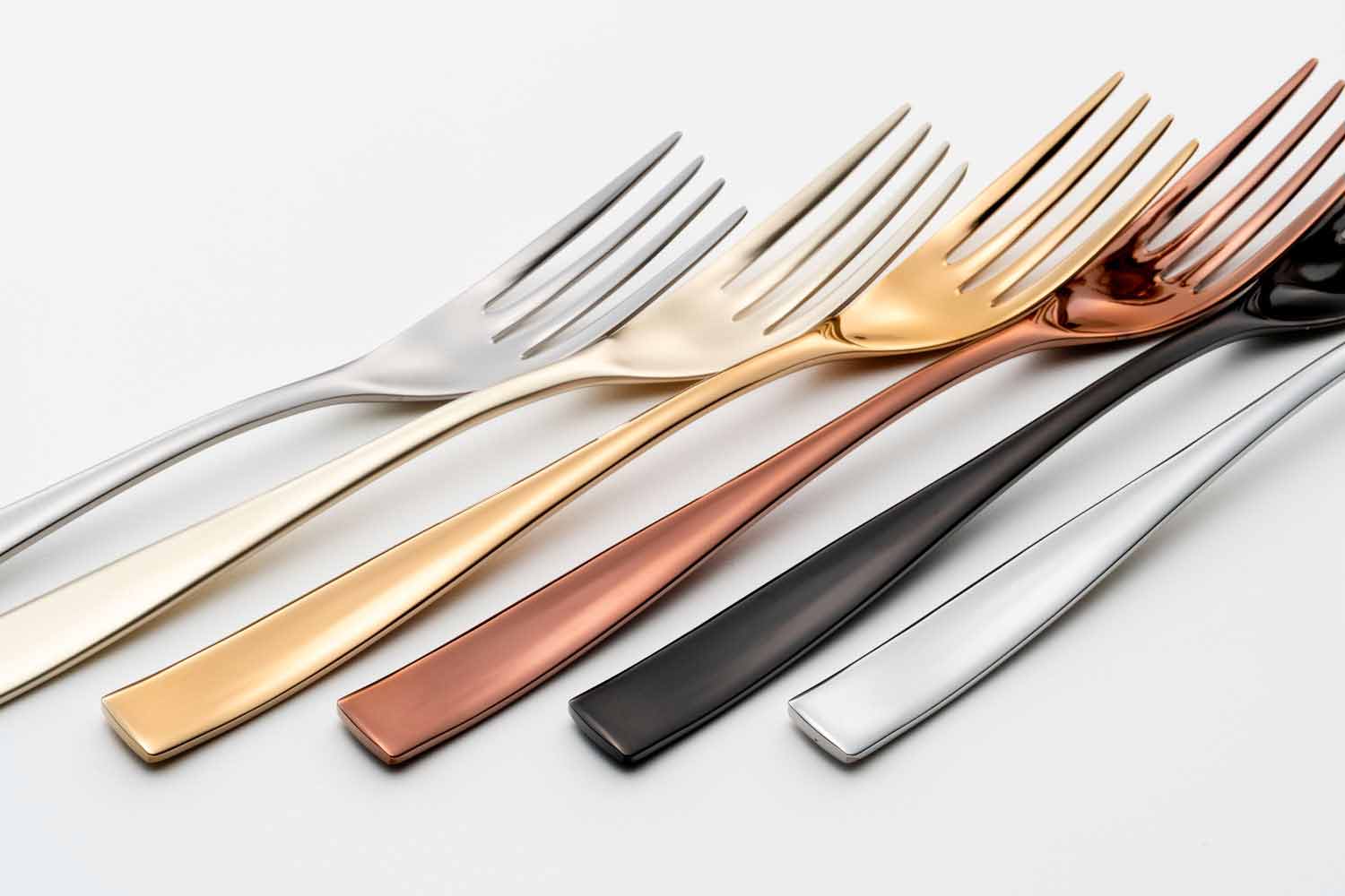 PVD is the acronym for Physical Vapor Deposition, which is a technology used to colour steel in special vacuum chambers where very thin metal films are steam sprayed, which condense on the cutlery. This treatment, with a range of wonderful shades of colour, in addition to embellishing the cutlery, makes them more