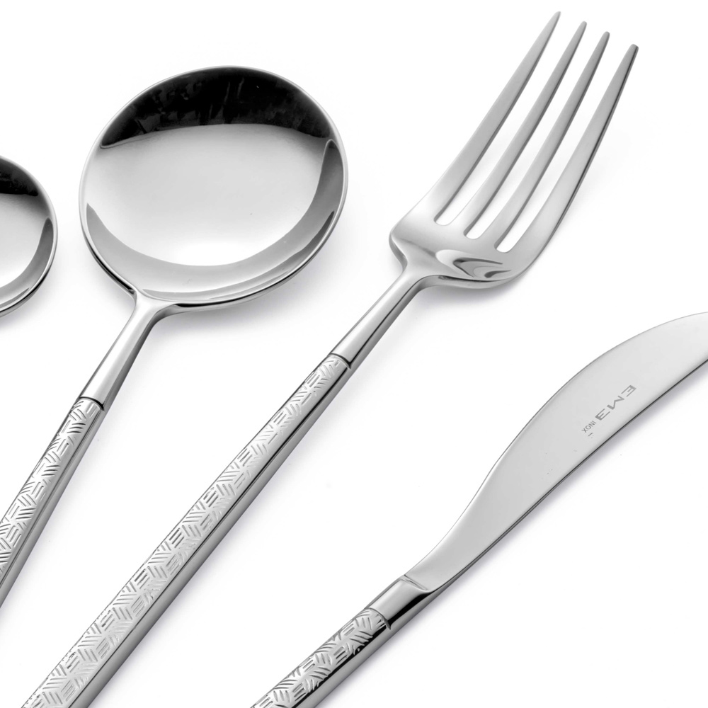 The cutlery features clean, modern queues, with the detailed handle contrasting beautifully with the smooth surfaces of the utensils, giving a contemporary look that can elevate any table setting. This set is perfect for those looking to combine everyday functionality with a unique design aesthetic.