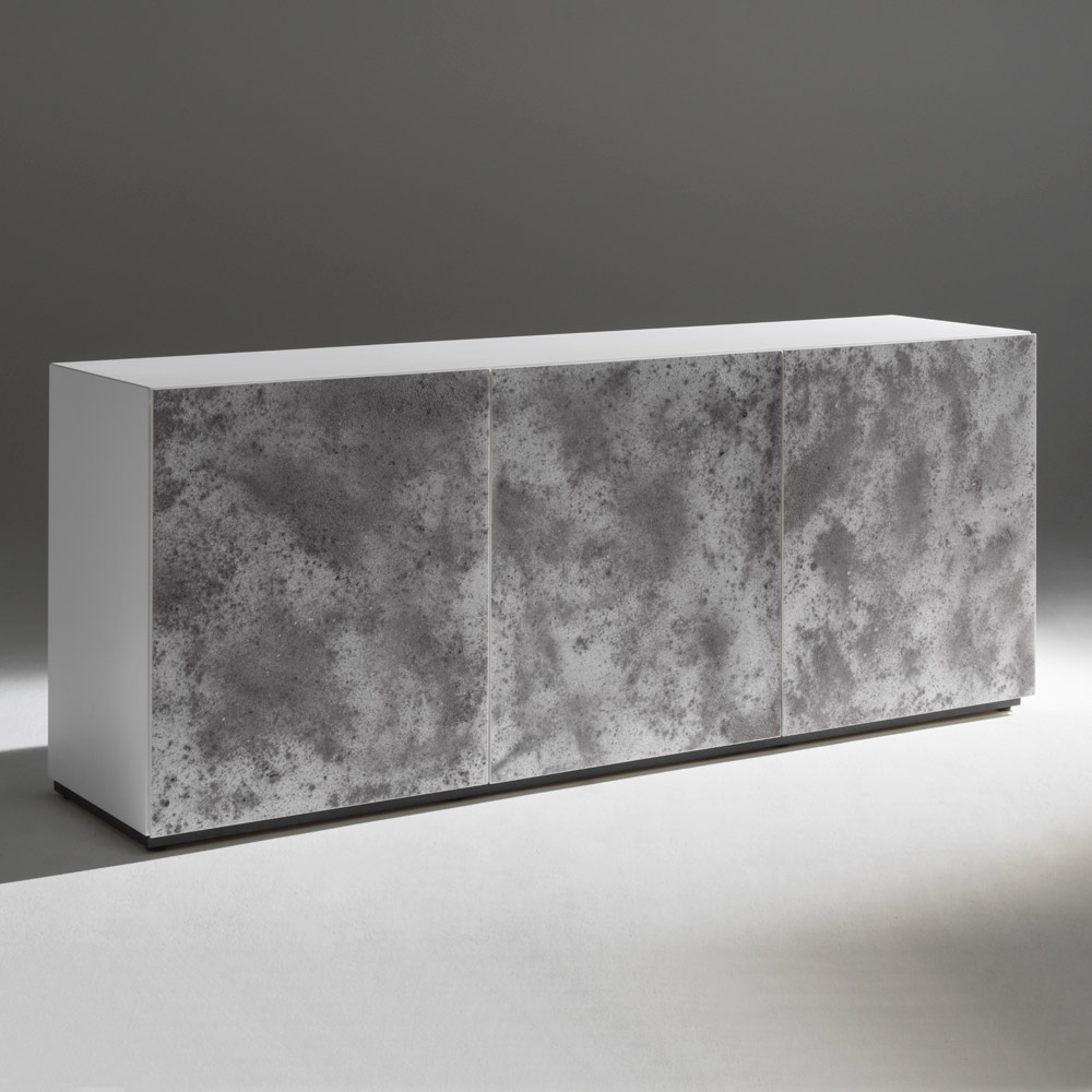 A sideboard with a minimalist, contemporary design, featuring pure volumes and sophisticated textured surfaces. A dramatic and functional piece, ideal for living rooms, dining rooms, and contract spaces with a modern, sophisticated feel.