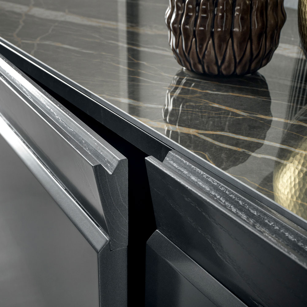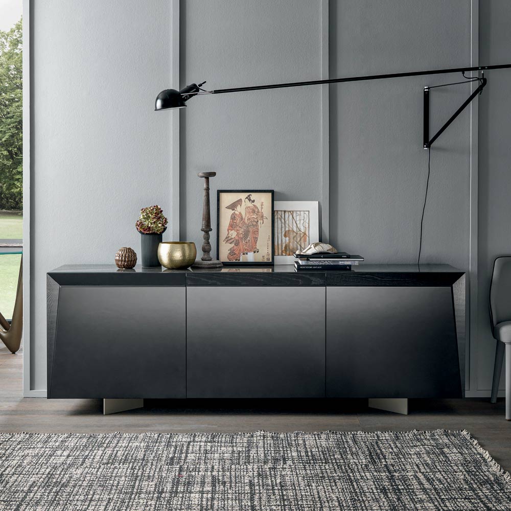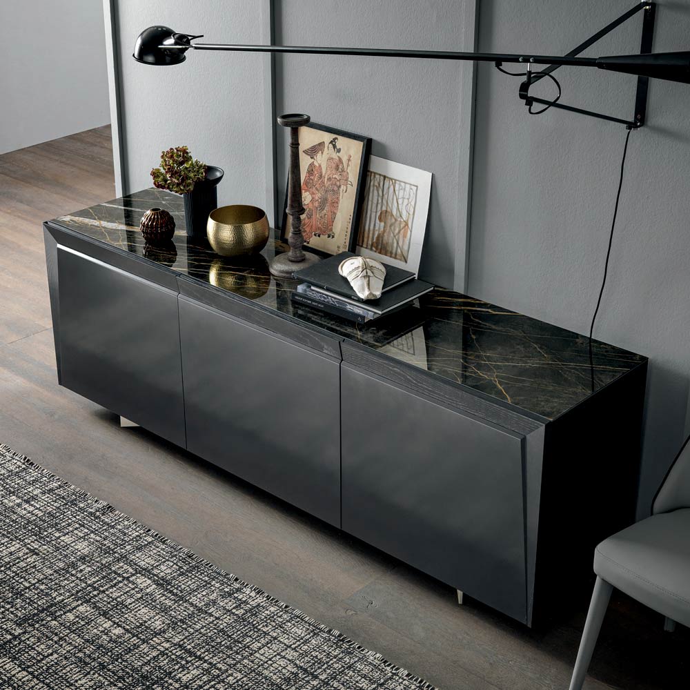 3-door MDF sideboard with inclined edge and glossy ceramic top made in Italy.
