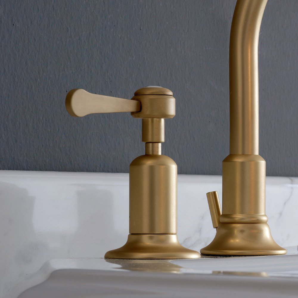 This exquisite faucet 3-hole high spout and with drain è entirely handcrafted by experienced craftsmen in the industry from heavy brass, cast in moulds that respect the craft systems of the past and protected with a thick top coat matte brass.