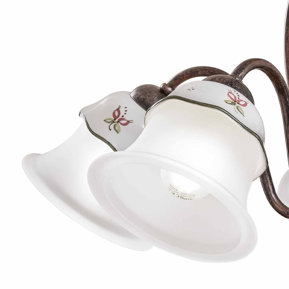 Chandelier with 3 or 5 lights in iron, hand-decorated ceramic and acid-etched glass made in Italy by Ferroluce.