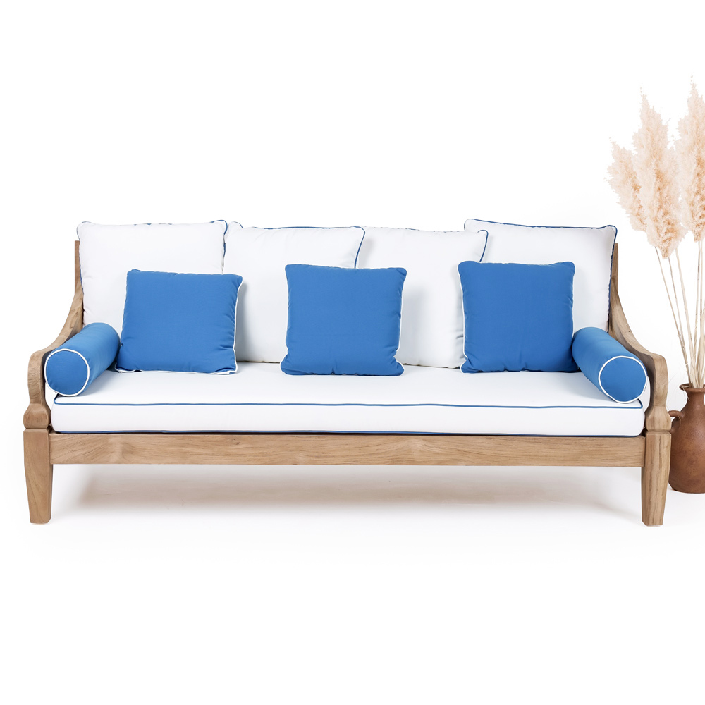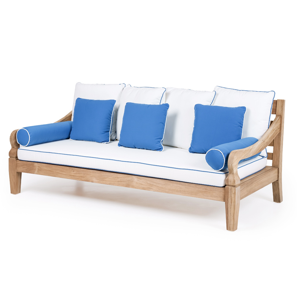 3 seater outdoor sofa in brushed natural teak wood with padded cushions