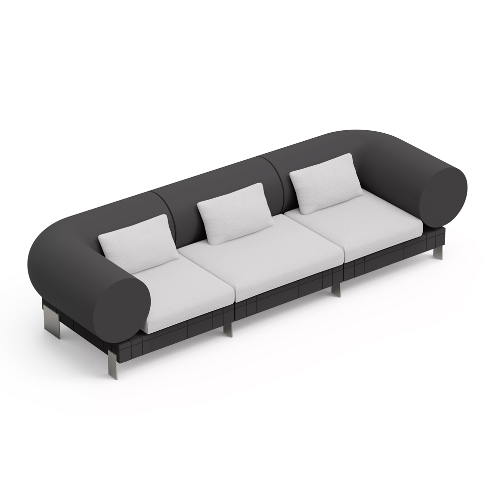 Sofa made with polyethylene structure, seat cushions and 3 back cushions in Sunbrella fabric and metal feet.
