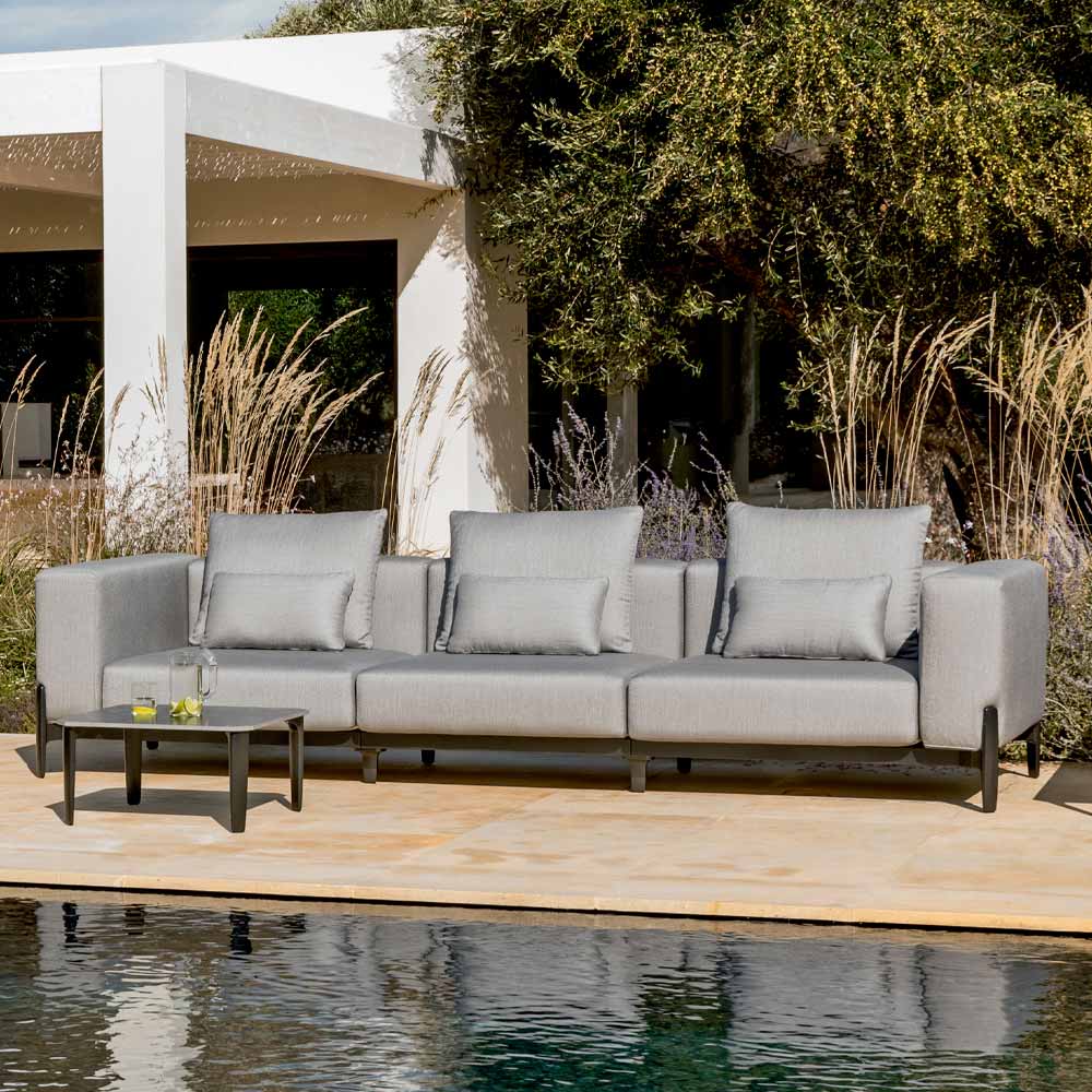 3 seater outdoor design sofa in aluminium and cushions in waterproof fabric, high quality made in Italy.