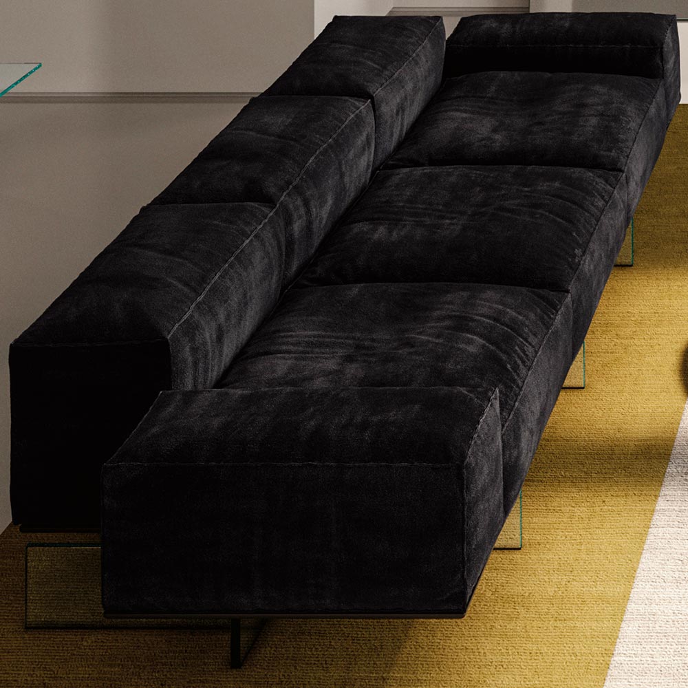 Composed of soft and generously padded volumes, the seating system introduces a new way of designing the living space, with elements that allow for original, more dynamic and informal compositions. The sofa retains its visual lightness thanks to the base which is made up of laminated glass feet supporting a wooden platform on which the upholstered elements rest. Sophisticated high quality fabrics and refined details in the packaging are the distinctive features of a project with an unconventional character.