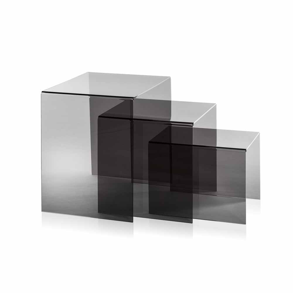 Set of 3 stackable tables, made in 100% PMMA from virgin polymer, smoke-grey colour, thermoformed and self-supporting.