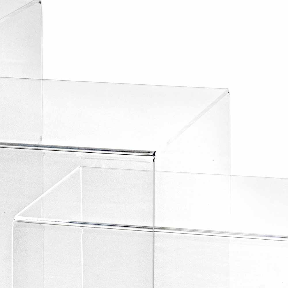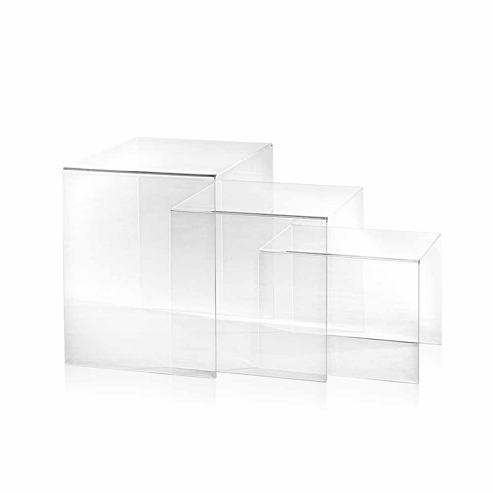 Set of 3 stackable tables, made in 100% PMMA from virgin polymer, transparent colour, thermoformed and self-supporting.