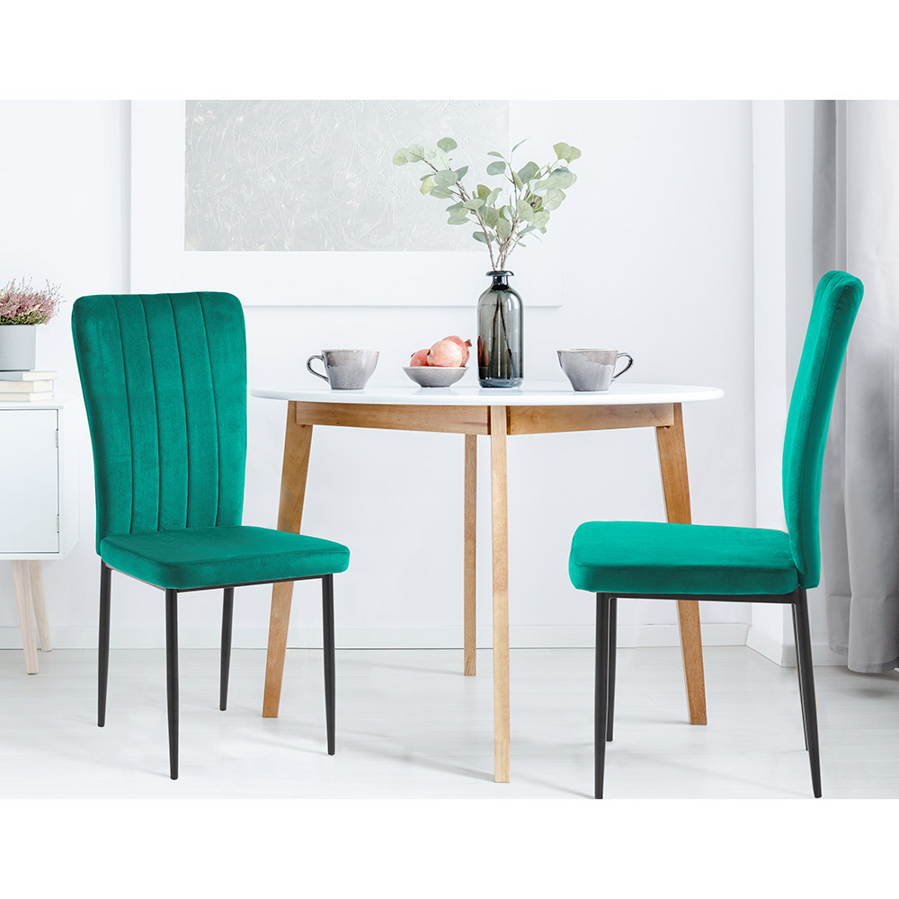 The thin, black legs provide a striking visual contrast that further accentuates the modern design of the chair, ensuring stability and durability . The high backrest is designed to provide adequate support, making this chair ideal for long sessions, whether it is an extended dinner or a work session.