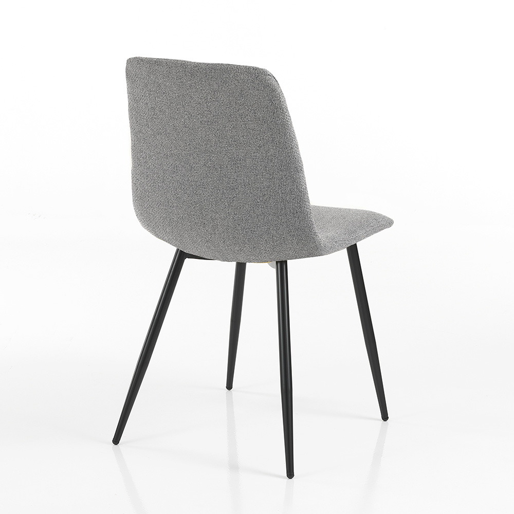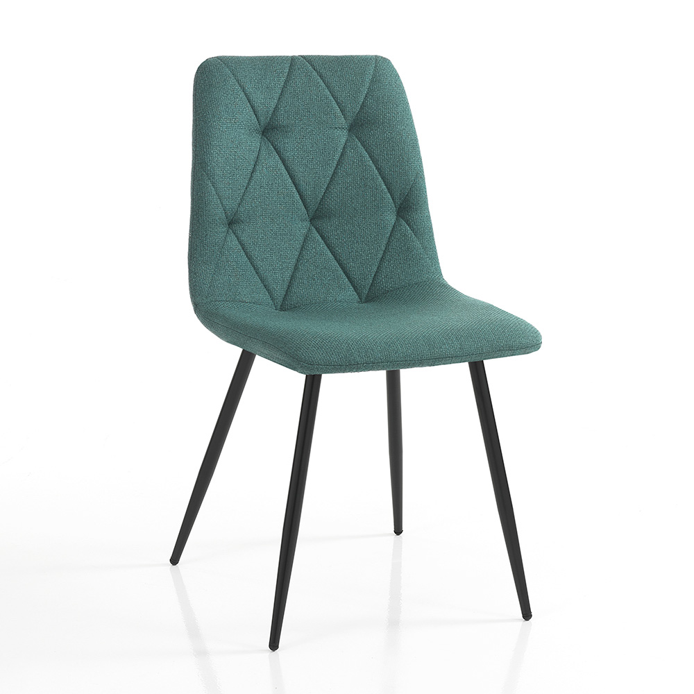 The design is enhanced by a quilted diamond pattern on the backrest, which not only increases comfort but also adds a visual element of texture and depth, giving the chair a sophisticated and modern look. The black metal legs are thin but sturdy, offering a solid base and a nice contrast to the seat fabric.