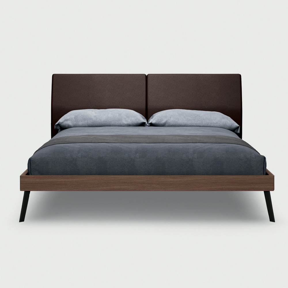 padded headboard covered in eco-leather, 2 bedside tables with 2 drawers each and a high chest of 6 drawers in wood matching the bed frame.