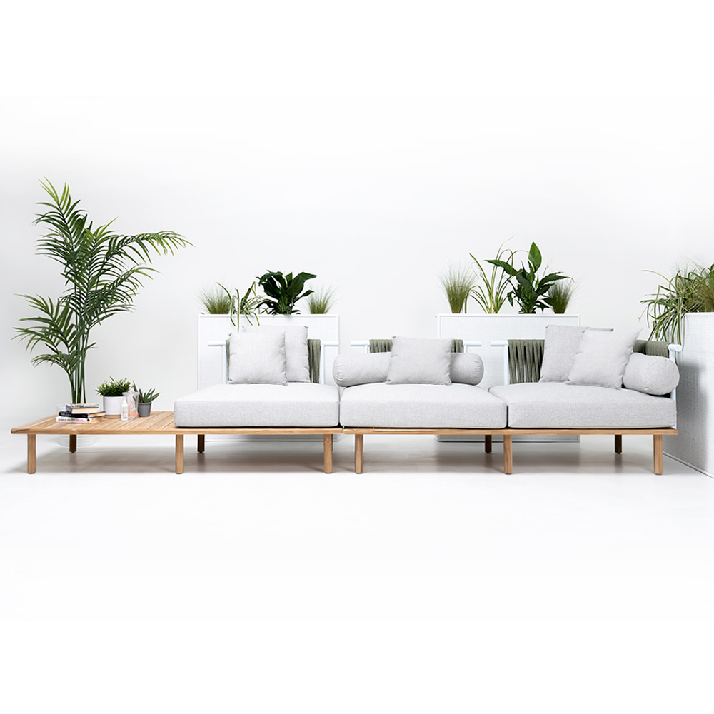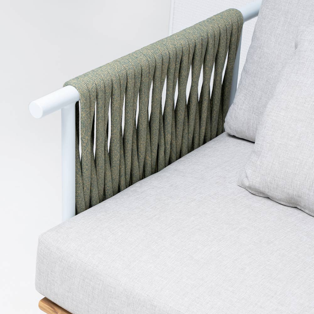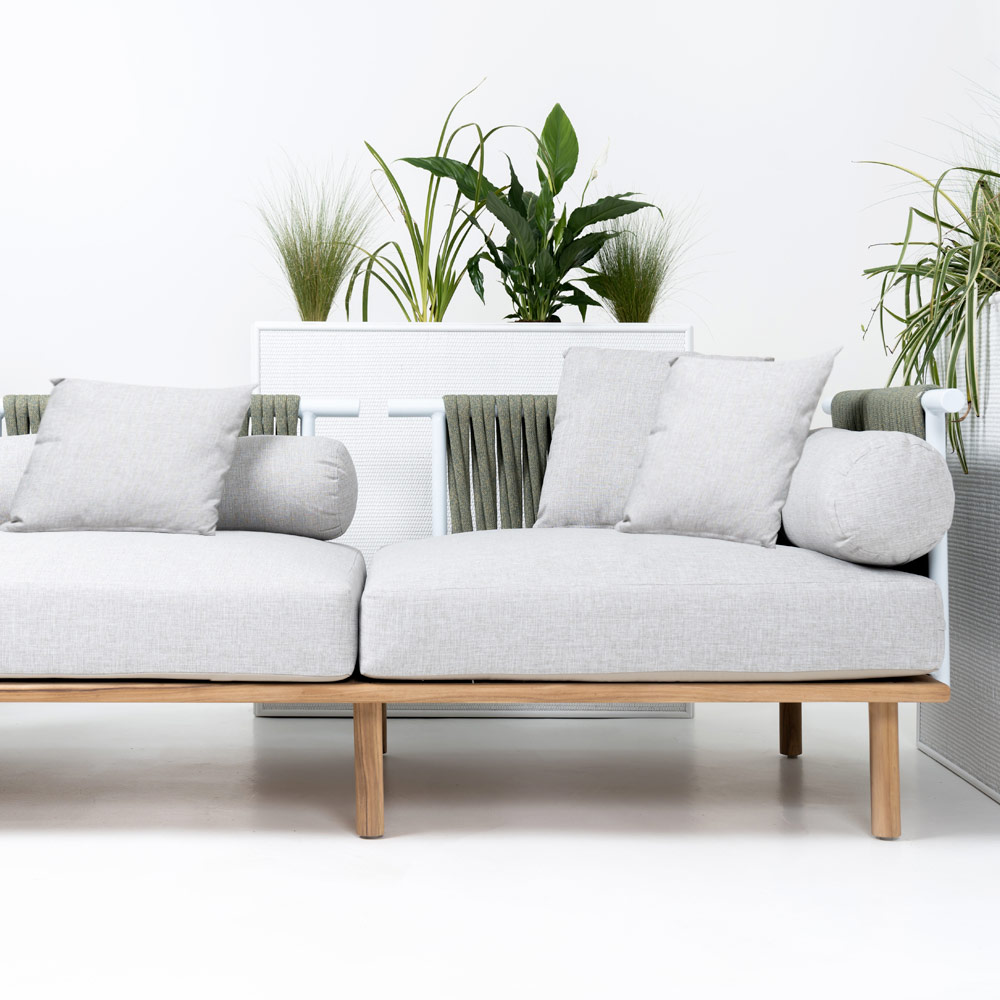 Modular garden sofa in teak, aluminium backrests and weave in Olefin/PP ROPE and cushions