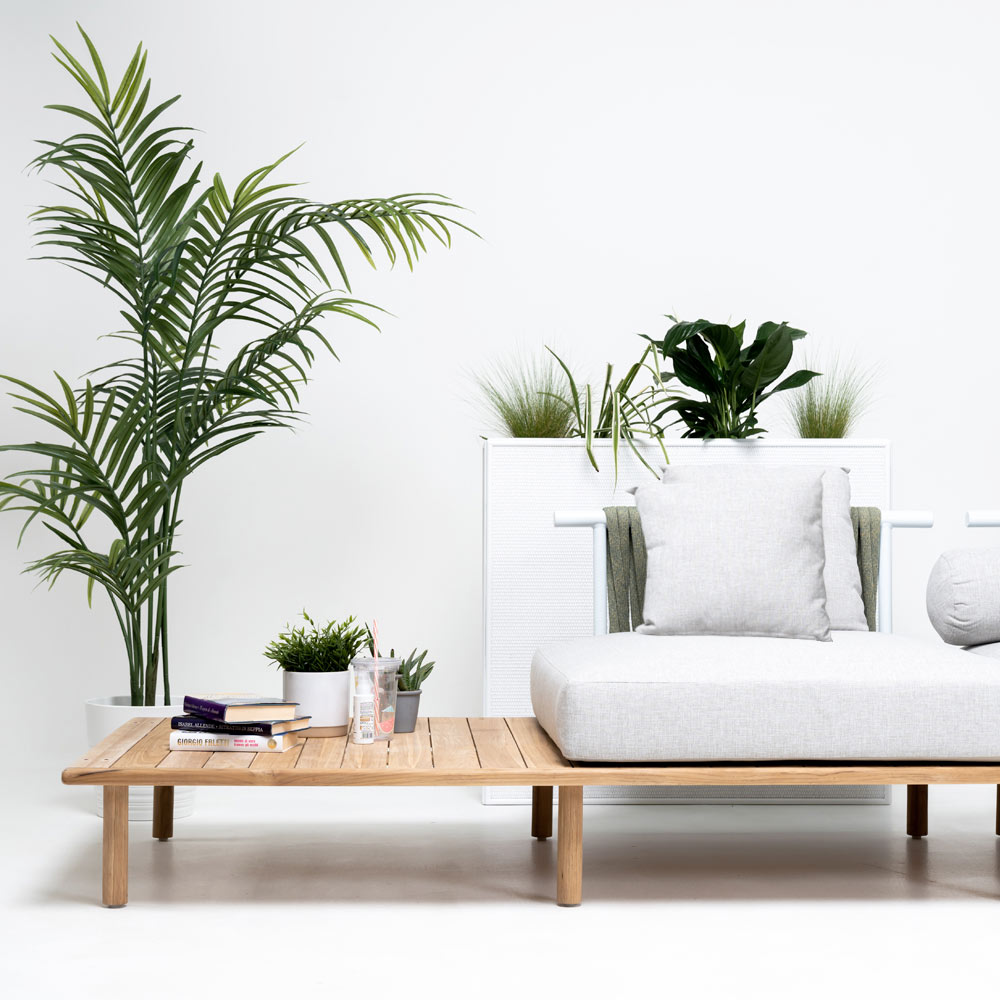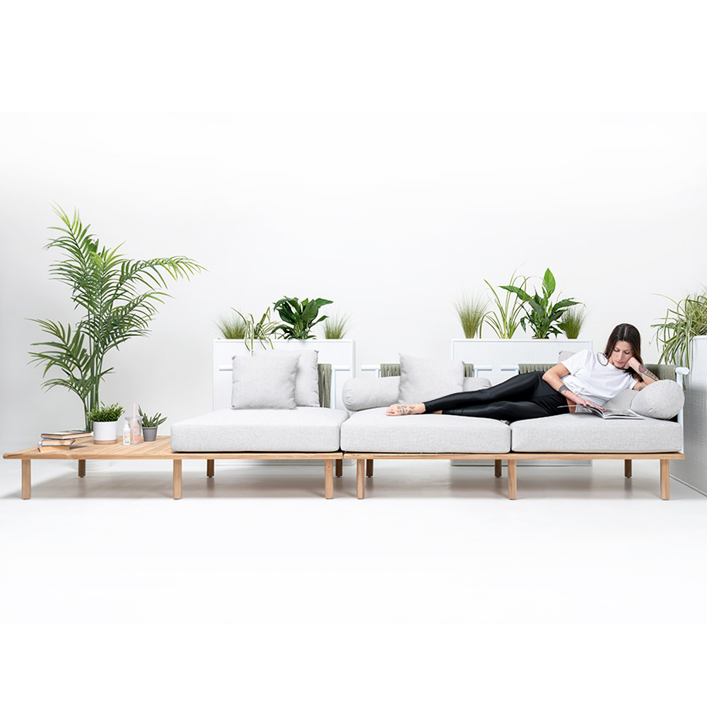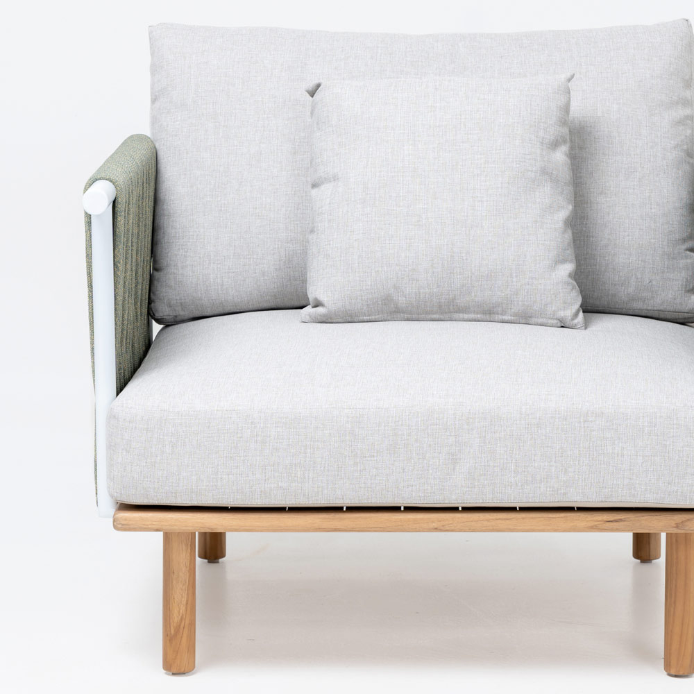 This garden sofa is a true oasis of outdoor relaxation , an invitation to enjoy the beauty and tranquility of your garden. Its clean and linear design makes it a versatile piece, ideal for adding a touch of elegance to any outdoor space. The natural teak frame marries perfectly with the neutral shade of the fabric, creating a combination of style and naturalness that captures the essence of outdoor living.