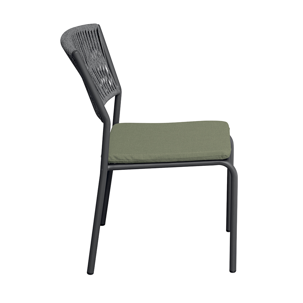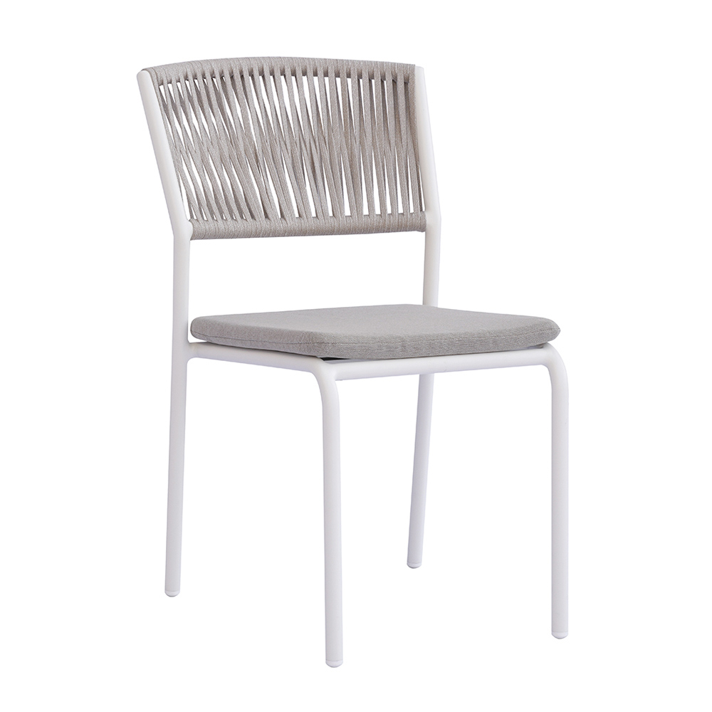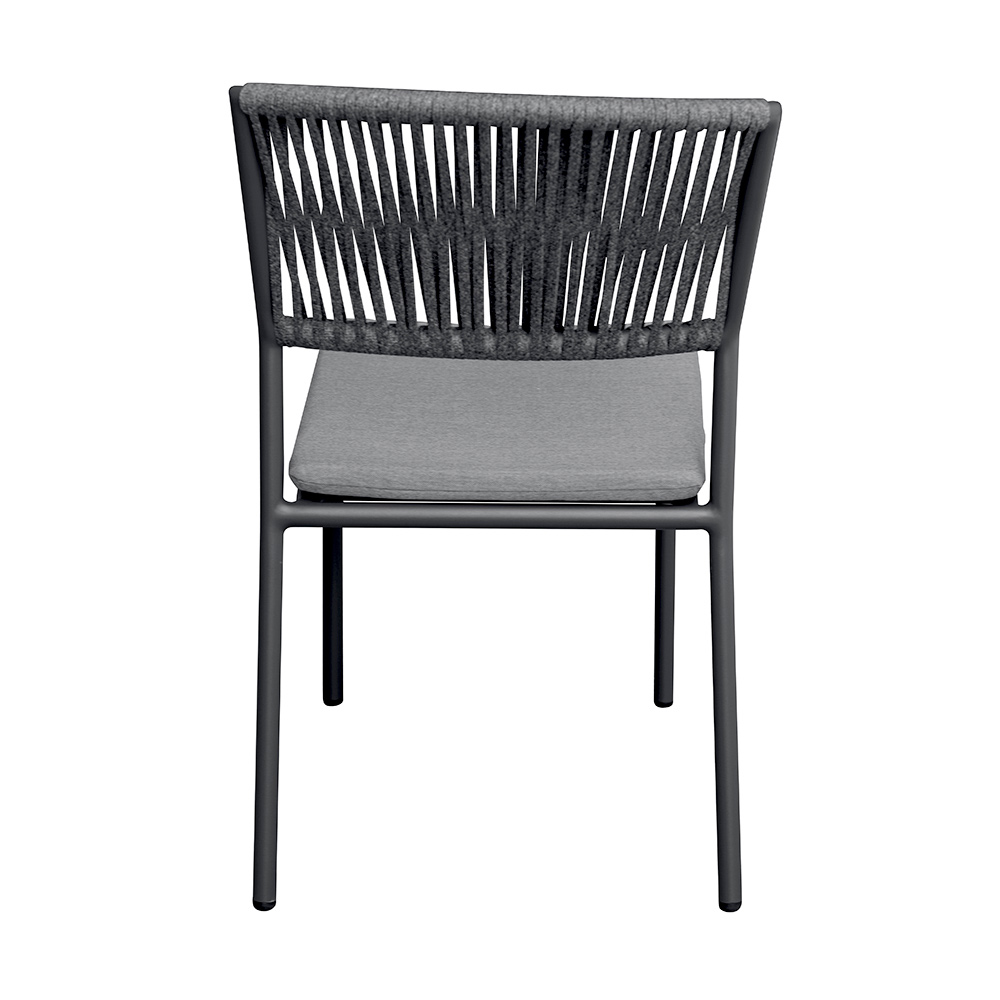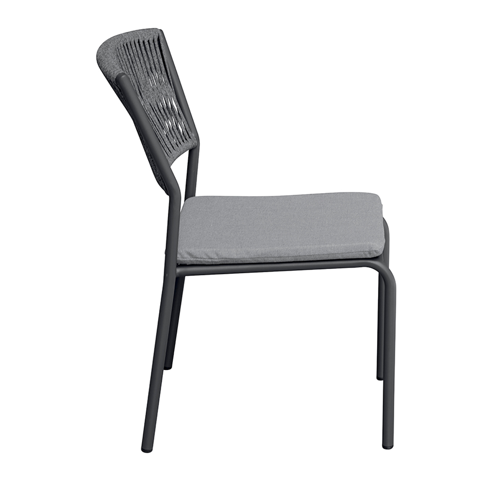 The outdoor rope backrest adds a refined, contemporary touch, ensuring comfort and breathability, while the aluminum seat with matching cushion offers softness and comfort, making every moment of relaxation even more enjoyable.