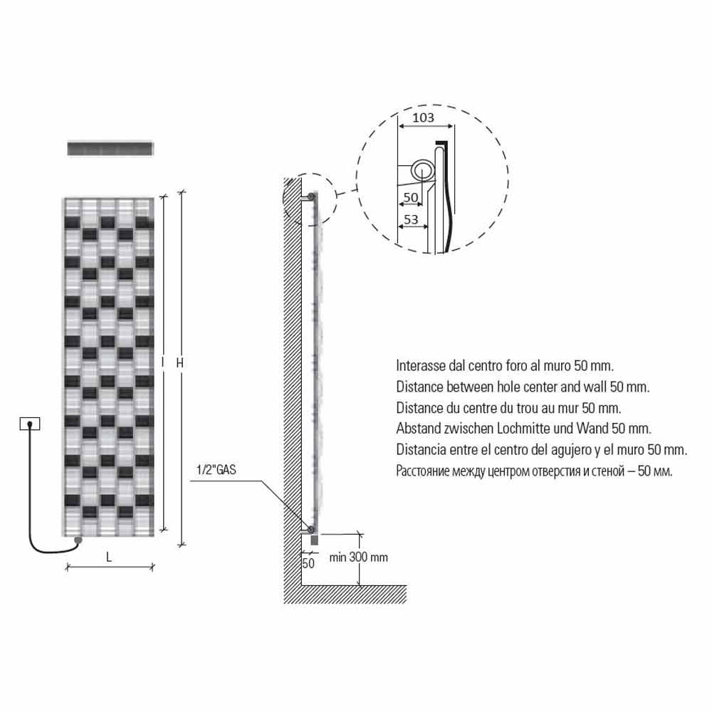 The 110 mm thermostat must be added to the height. White thermostatic box as standard for white radiators; chrome for the colored radiators and stainless steel finishes. Single-phase 230 volt power supply.