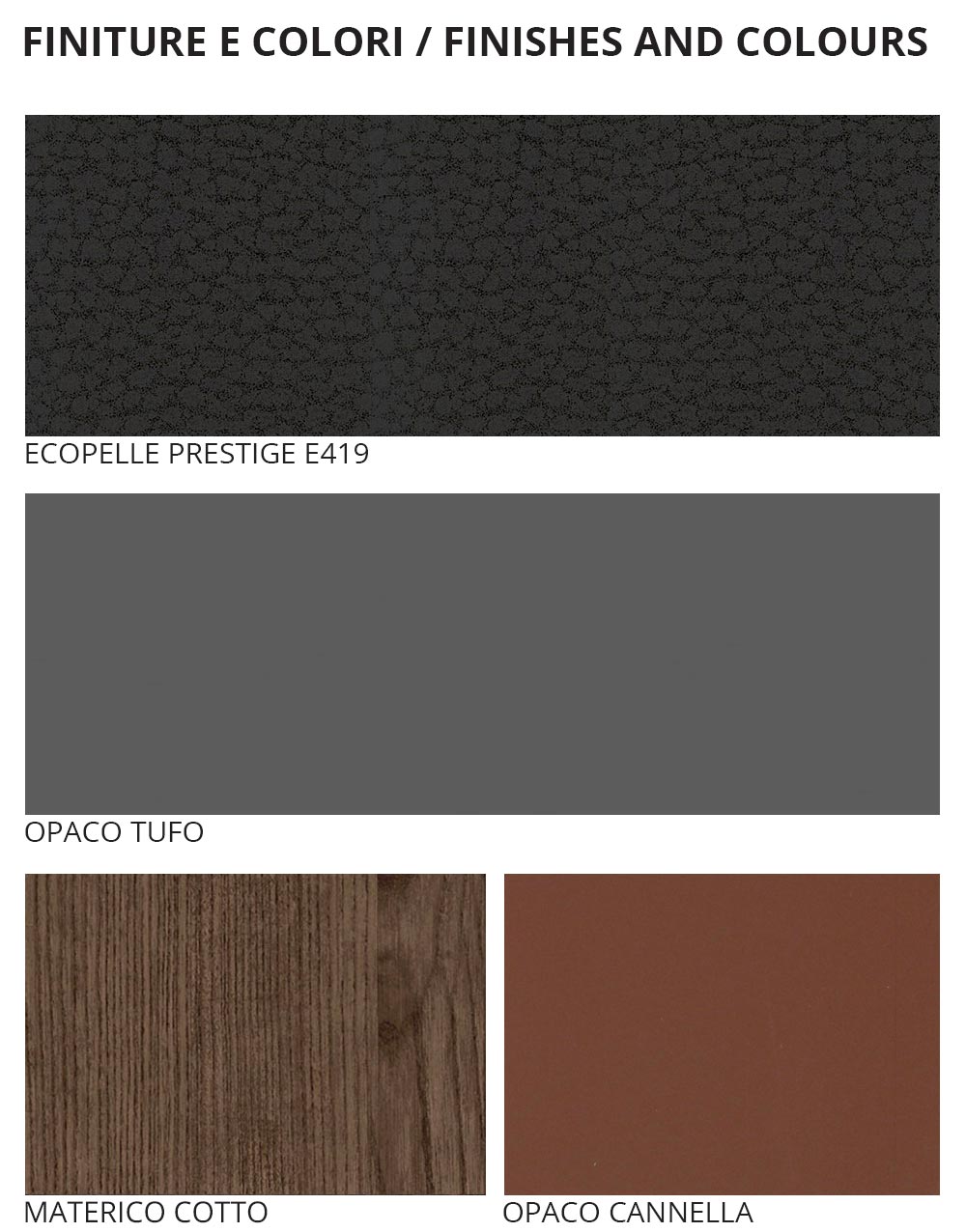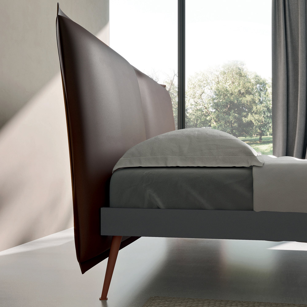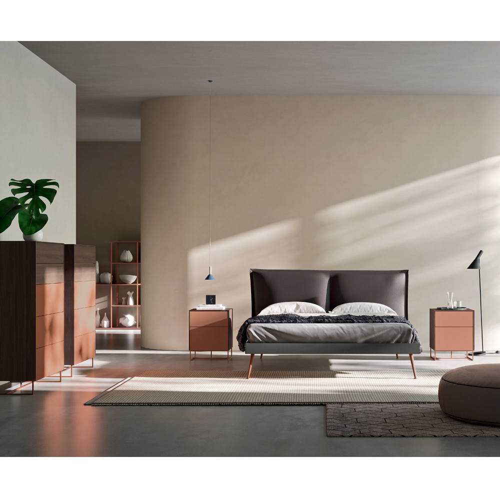 eco-leather and feet in cinnamon lacquered wood, two bedside tables (2 drawers) and two chest of drawers (5 drawers) in the same colour as the feet of the bed enriched by details in textured terracotta finish. From the particular attention to details and the