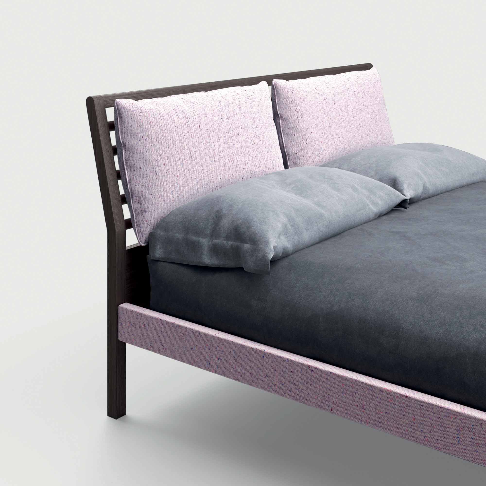 bed frame upholstered in fabric matching the two cushions covering the headboard,