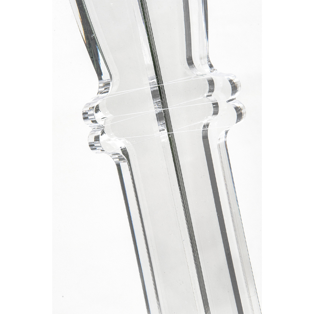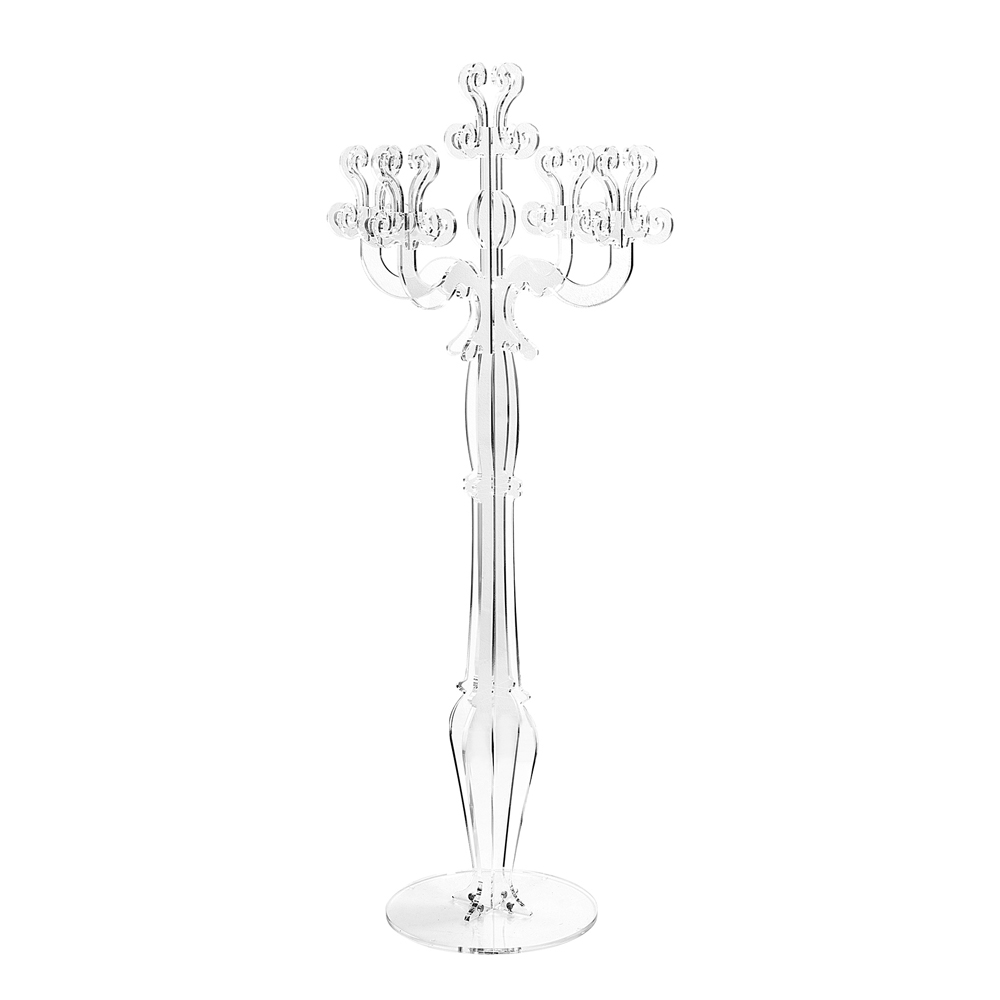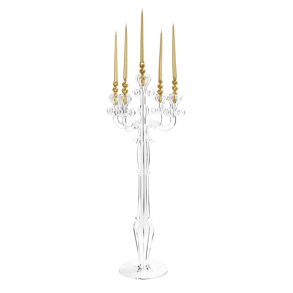 Made of 100% PMMA plexiglass from transparent virgin polymer, the laser-cut shapes recall the precious ornaments of Renaissance rock crystal candlesticks.