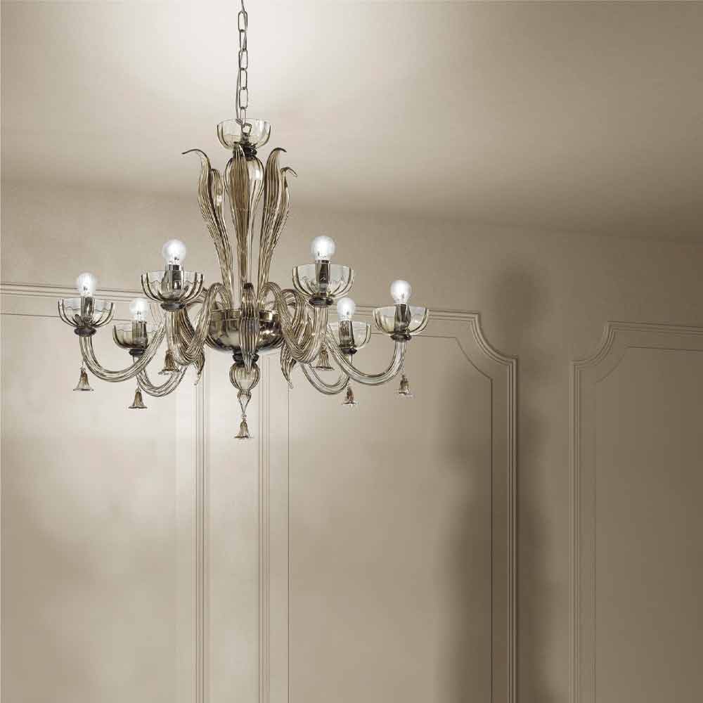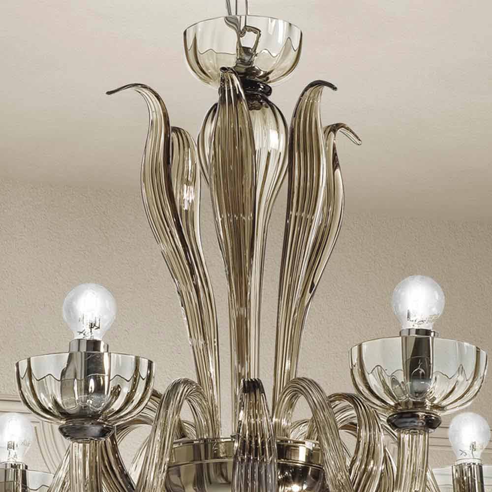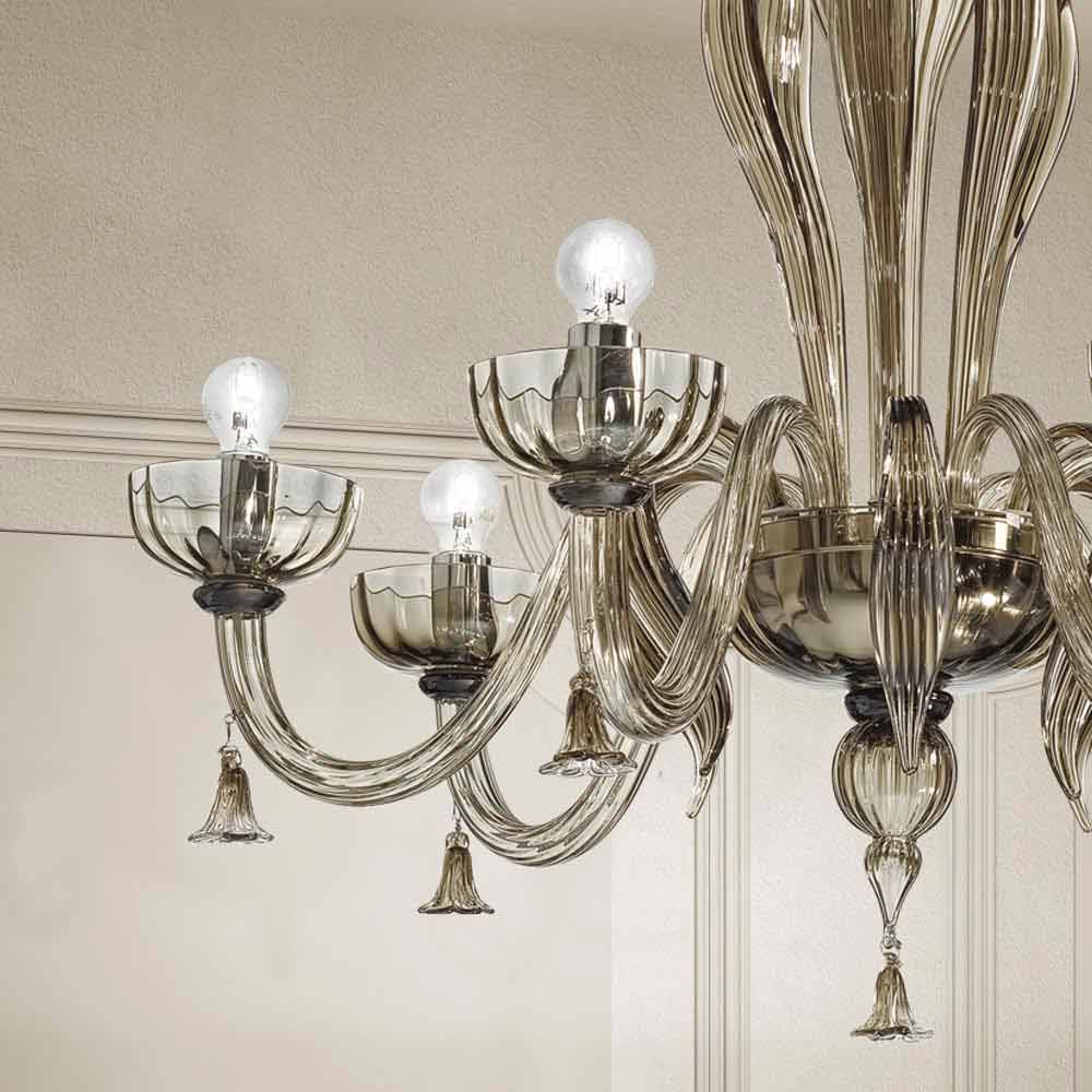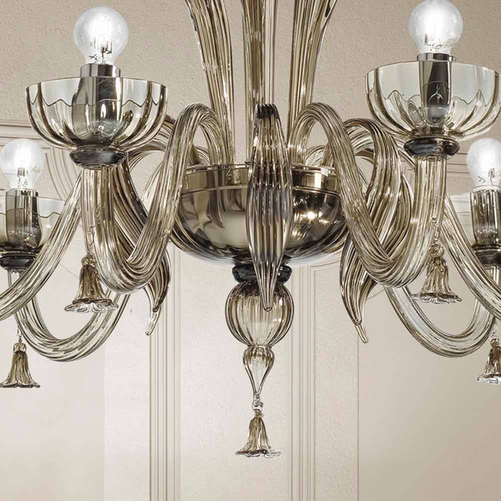 Classic chandelier made in Italy in Venice in hand-worked smoked finish glass with polished chrome finish metal details. This wonderful piece of furniture is born from the use of the ancient technique of the covering, whose aesthetics is based on concepts of innovation and recalling the past at the same time. The particular attention to detail that is maintained throughout the glass manufacturing process is expressed through the transparencies and small elements that underline its value and immense value . An ideal furnishing solution to royally illuminate your home spaces such as the entrance, the lounge or the dining room, bringing an exclusive and classy touch to the furniture.