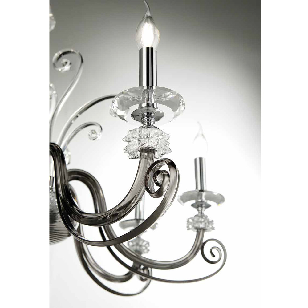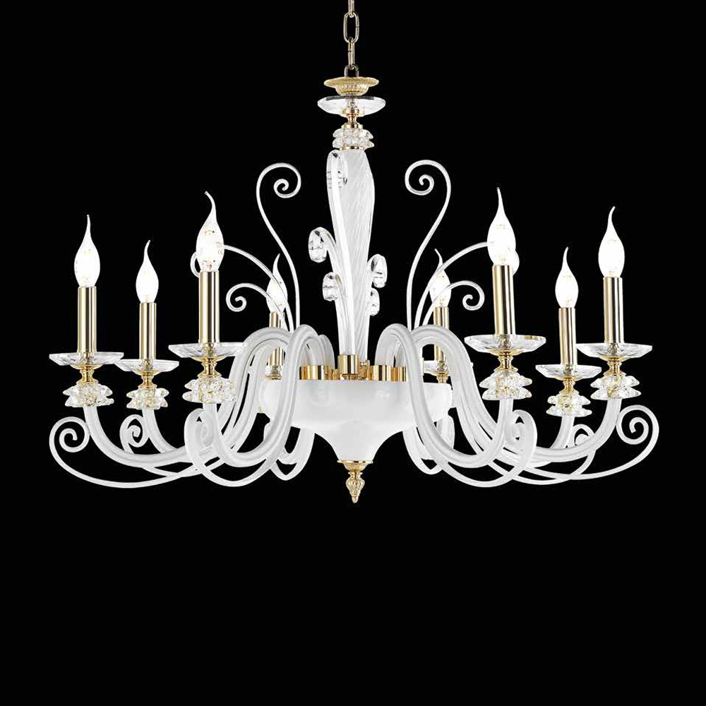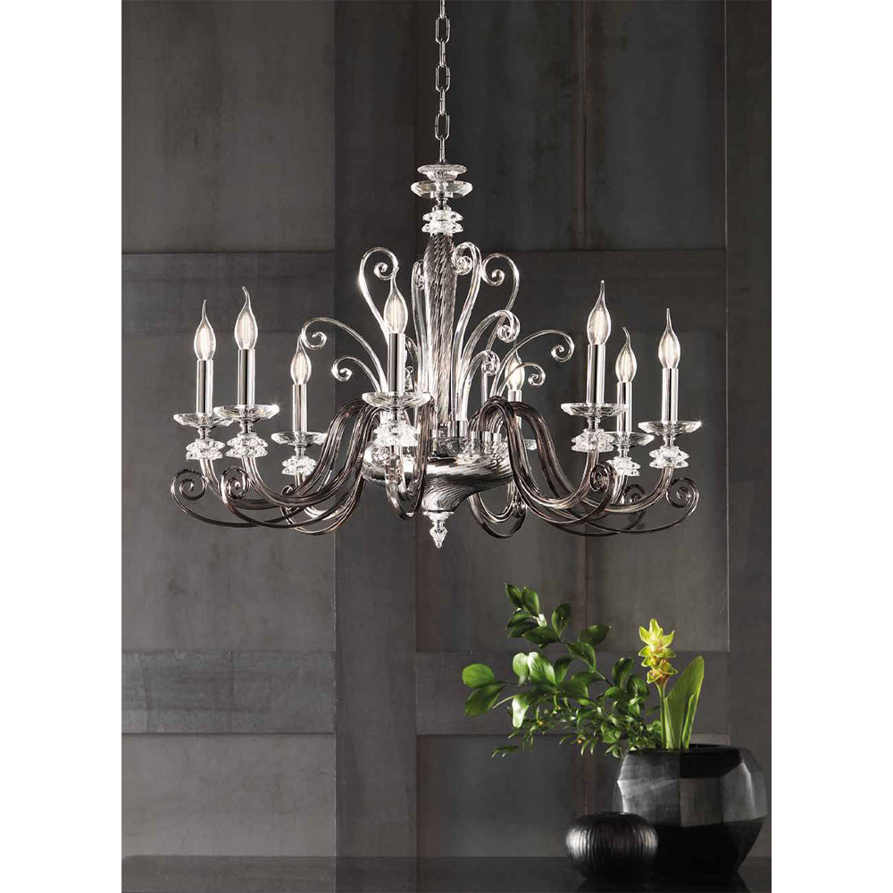 The 8-light chandelier is a luxury lighting accessory entirely handmade in Italy with a structure with metallic finishes combined with blown glass and high quality optical crystal.