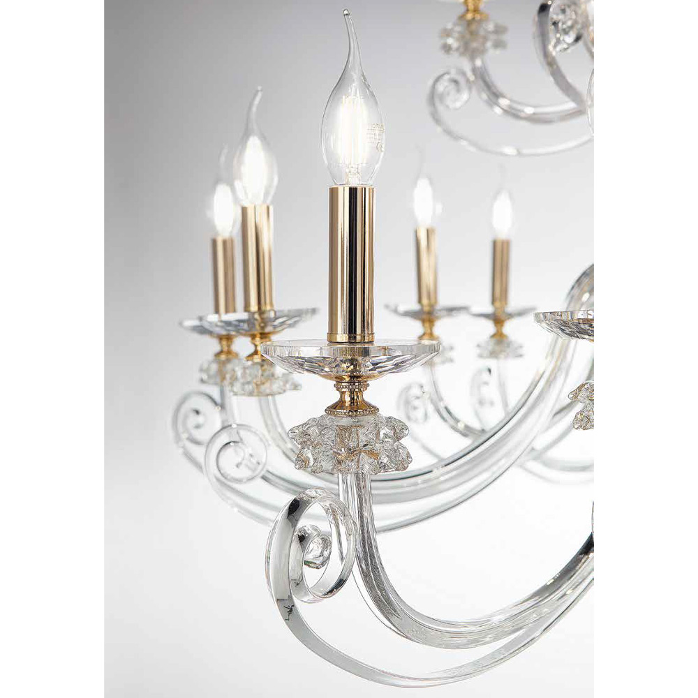 Handcrafted 8 lights chandelier in blown glass and optical crystal, luxury made in Italy.