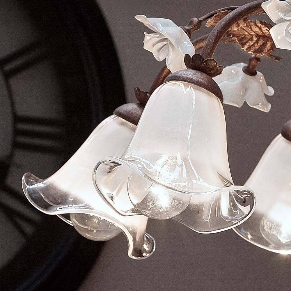 This 8-light chandelier is entirely made with a metal structure reminiscent of leafy branches and shaded sandblasted glass lampshades with handcrafted decorations in the shape of ceramic roses, Ā to highlight the skill and manual skills of the artisans.
