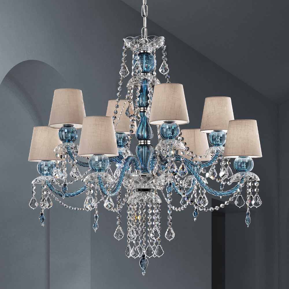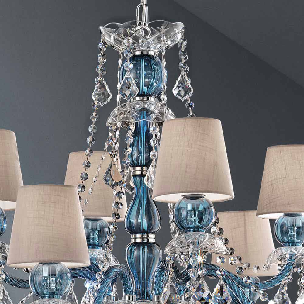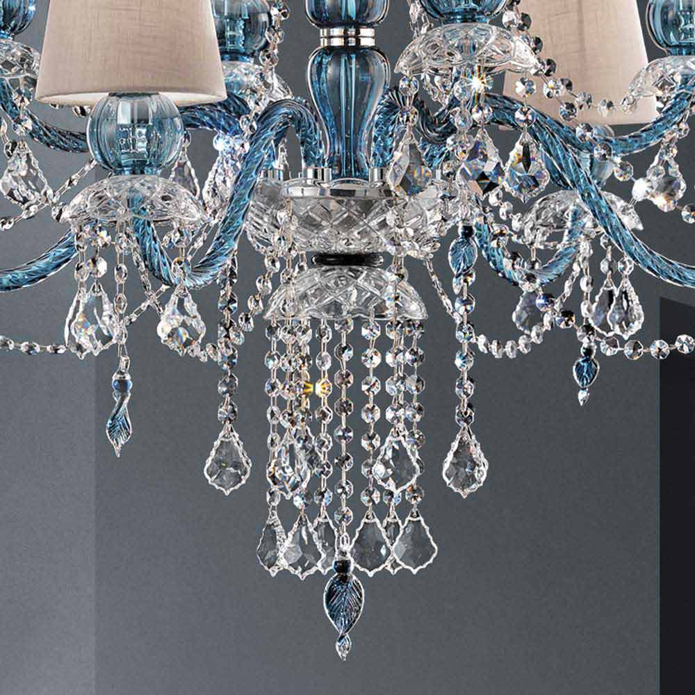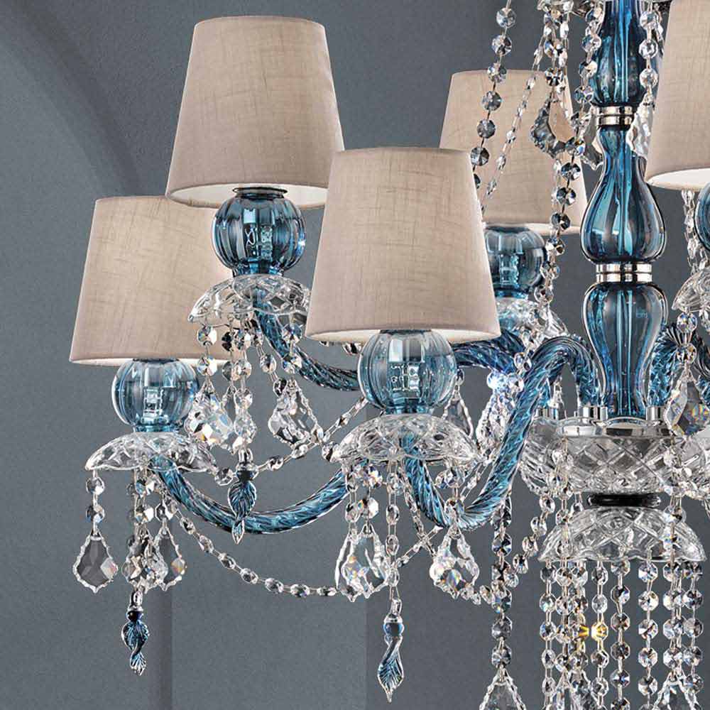Majestic 8-light chandelier with linen lampshades, blue finish Venice glass structure enriched with lead crystal finish pendants and polished chrome metal details, handcrafted in Italy . A piece of furniture with an extremely romantic character that completes the rooms by creating a wonderful atmosphere of timeless elegance. In this chandelier the soft light converges with the dynamism of the unprecedented light effects created by the brilliant pendants which, thanks to the refraction of light, give life to colored flashes with a strong visual impact .