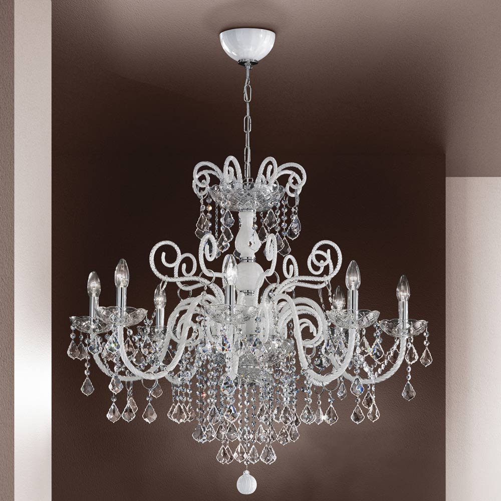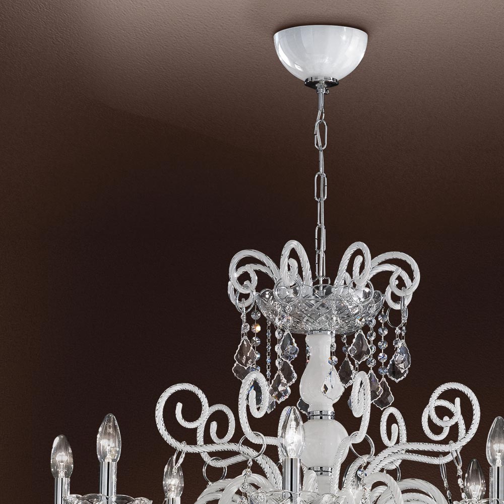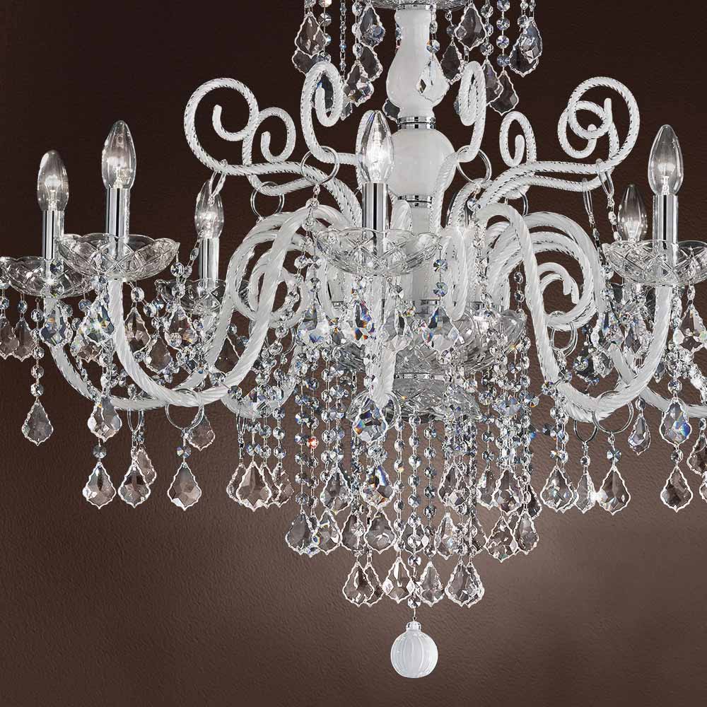 8 lights chandelier made of Venetian glass with milk white finish with lead pendants and polished chromed metal . Made through a craftsmanship , this complement is characterized by the wonderful arms worked by hand through the twisting technique which creates an exclusive result that aesthetically recalls the intertwining of a rope, giving personality to the chandelier. A real rain of light invades the structure of the chandelier and then spreads into the surrounding environment by means of refraction through the magic of sequins and crystal pendants with fine finishes, thus creating an evocative and dreamlike scenographic effect capable of enchanting and surprising. for its elegance and majesty .