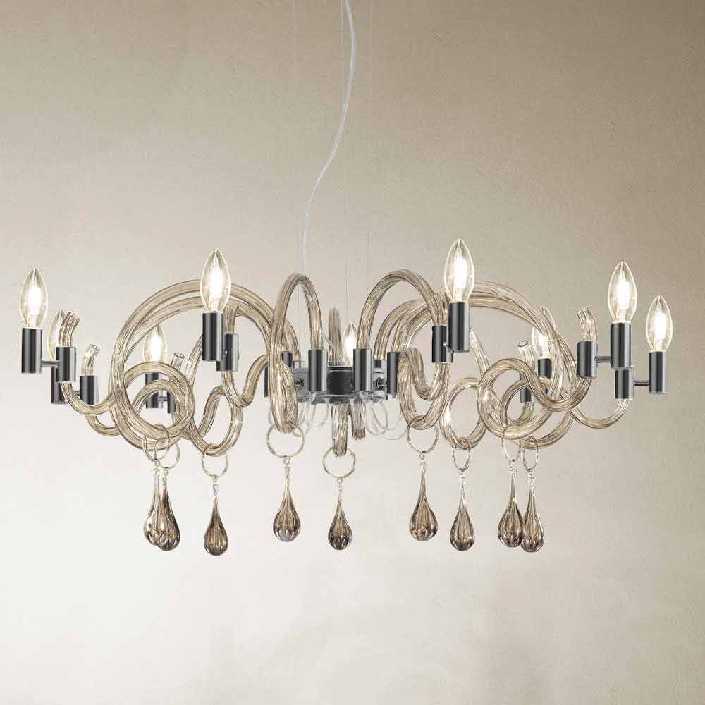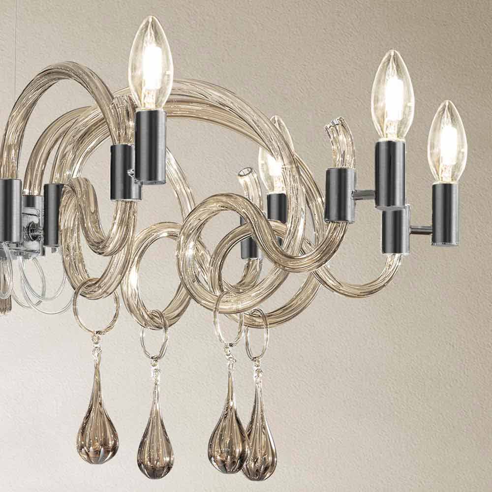 Impressive 9-light chandelier made in Italy in hand-crafted Venice smoked glass with metal details in brushed black nickel finish . A furnishing accessory with a strong stage presence that readjusts old chandeliers to a contemporary mold thanks to a design as articulated as it is essential, thus offering an ideal solution for both modern spaces and classic style environments. The curved arms and sinuous features of the structure allow the light to travel in different directions, creating wonderful plays of light and transparency for a result with a strong visual impact .